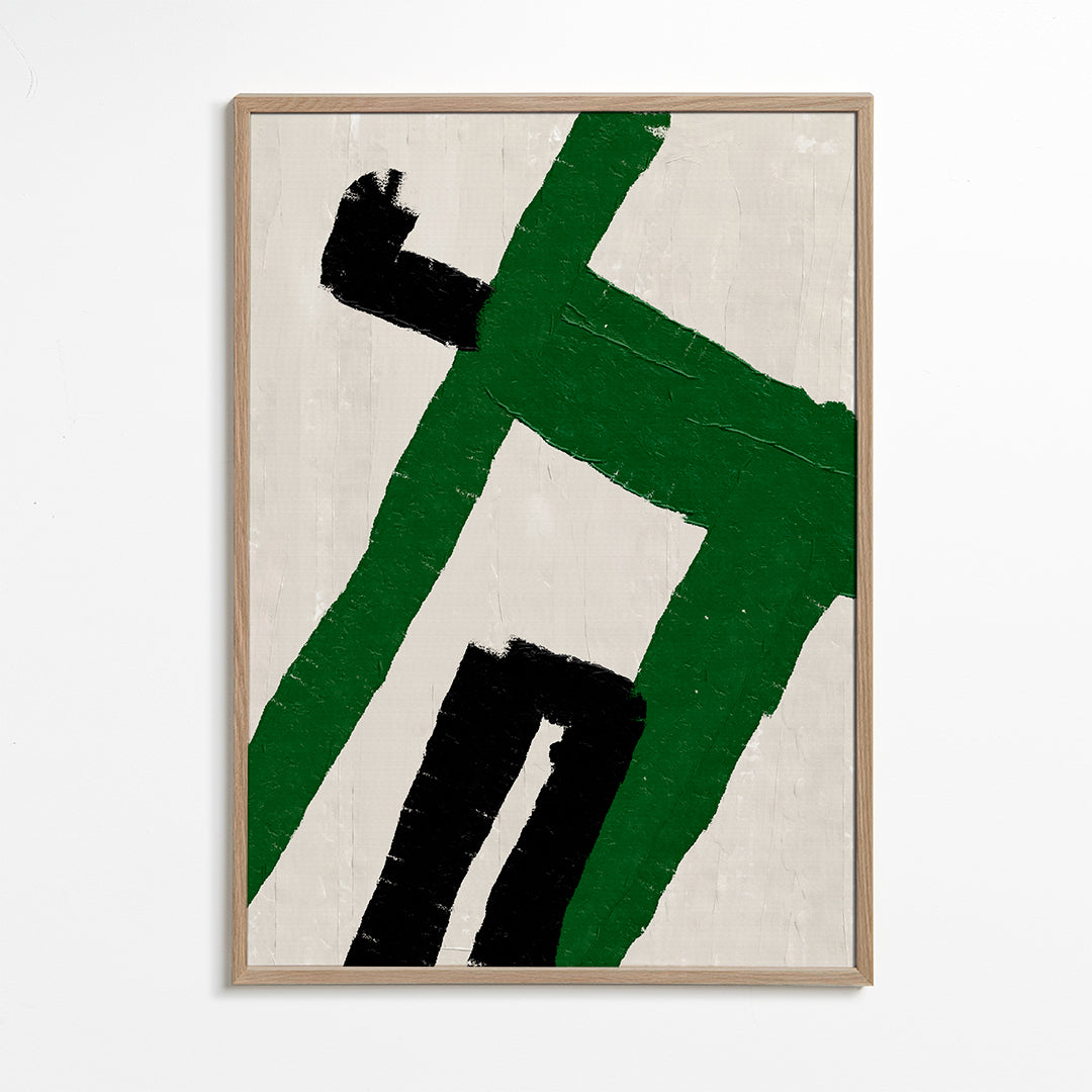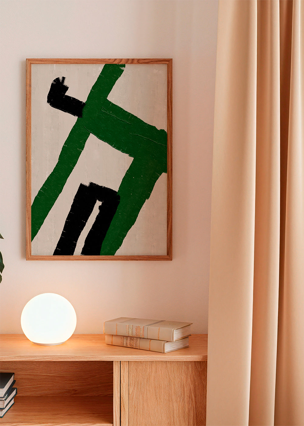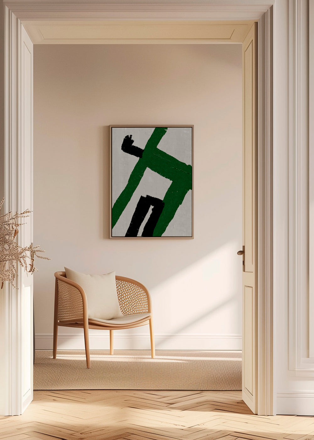 A piece from the geometric wall art and prints series, by creative artist 1x, with touches of green, and vertical layout. The abstract, geometric shapes help create a casual, creative setting. A modern touch for your home.