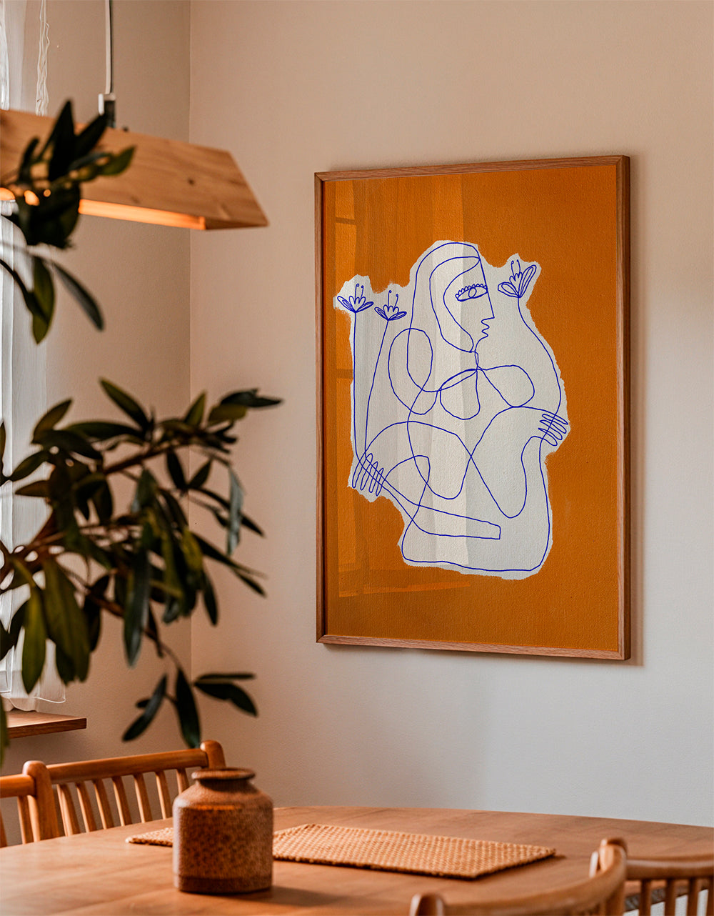 Art that tells. Charming drawing Vision of the artist Shatha Dafai. Elegant oranges palette styled in a vertical format. drawings are one of the clearest forms of art and this design will leave no one indifferent. Upgrade your space with style