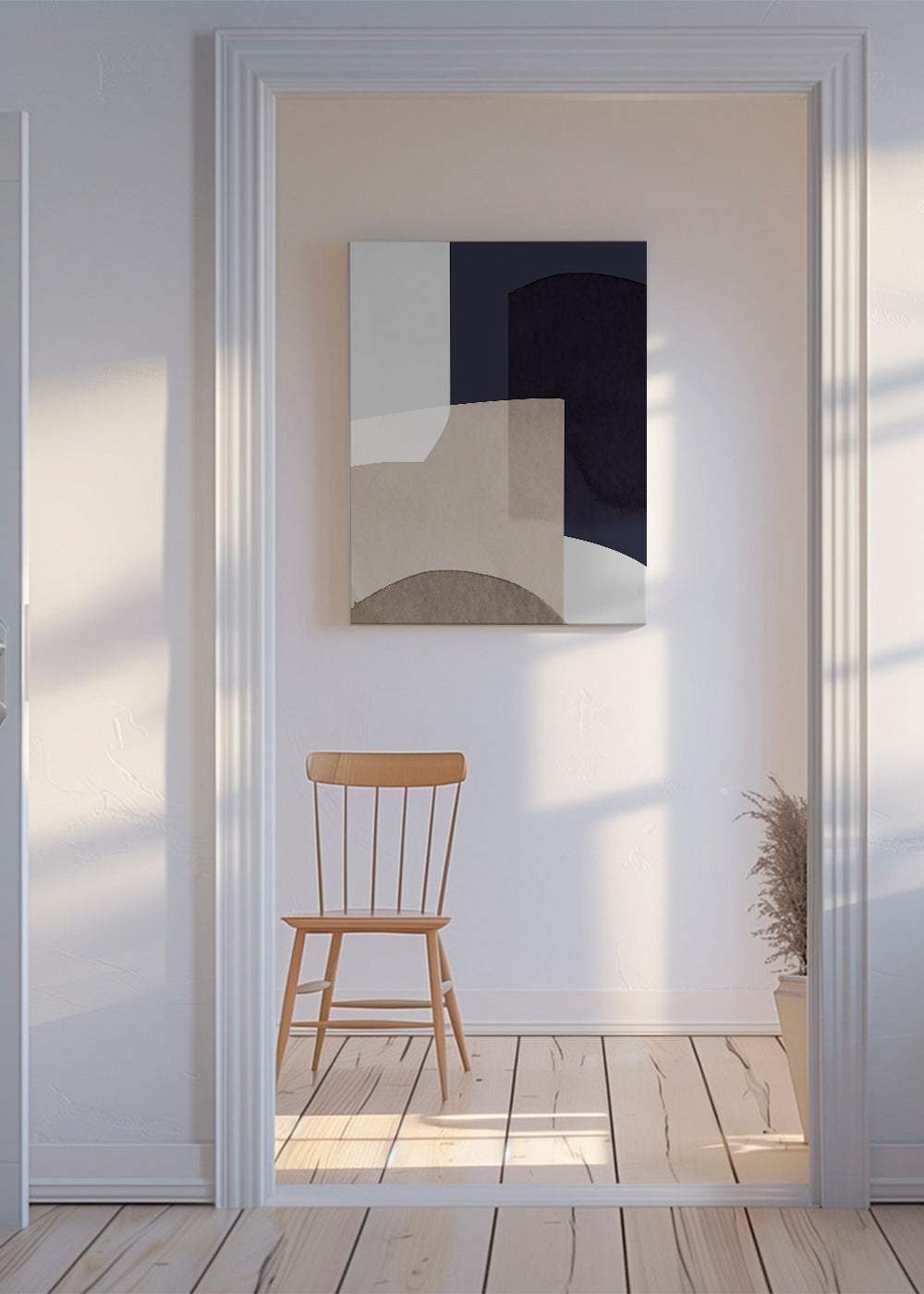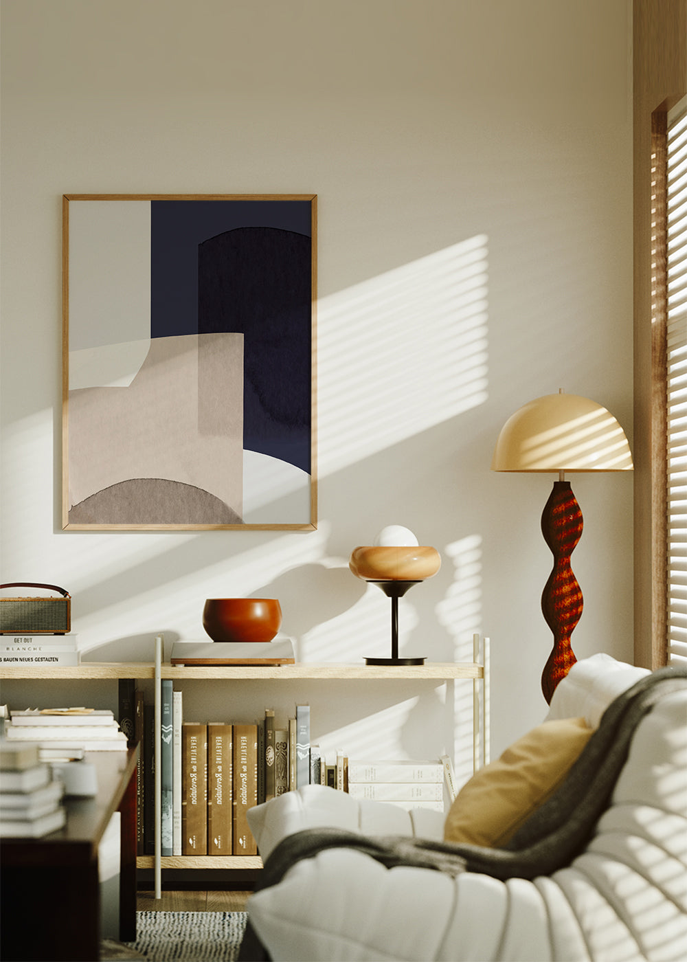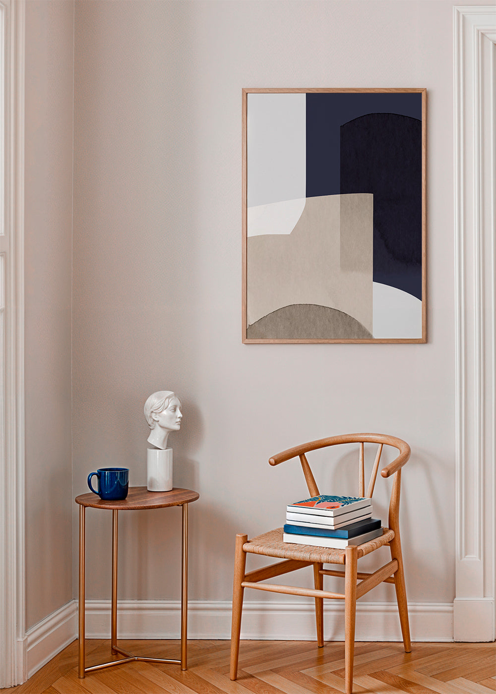 A design from our geometric wall art and prints series, created by Anna Mainz, in blue shades, and vertical layout. This piece with abstract shapes is perfect for pairing with other abstract art and geometric prints. Dress up your walls at home