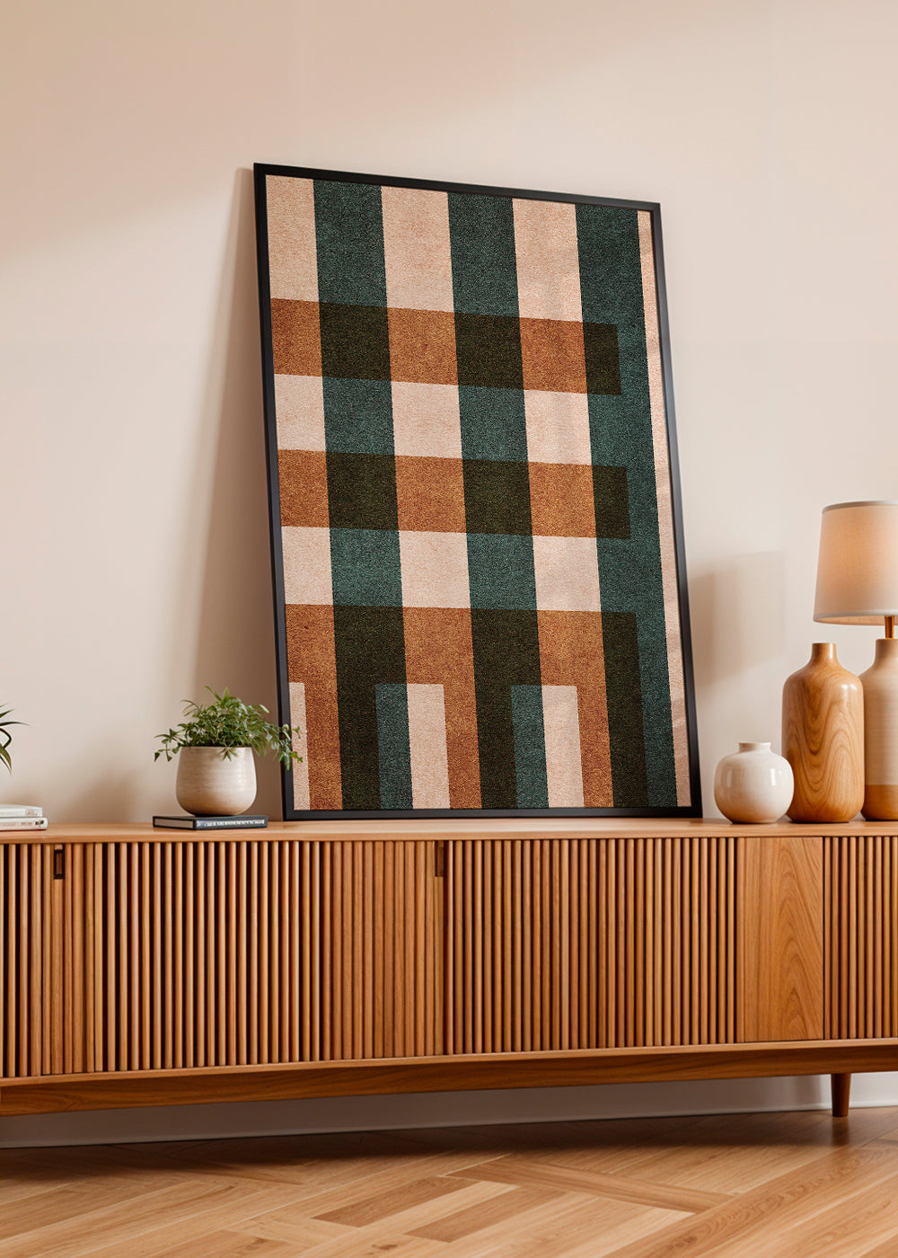 A poster in the style of our geometric wall art and prints, made by Daniel Coulmann, with tones of green, and with vertical layout. The abstract, geometric shapes help create a casual, creative setting. Refresh a whole room by just adding a few posters on the walls.