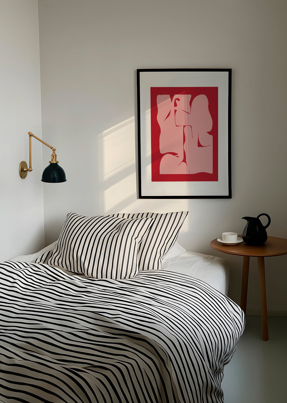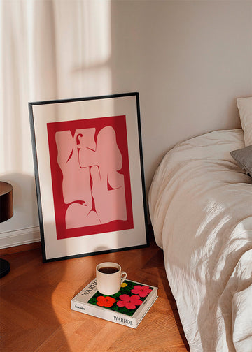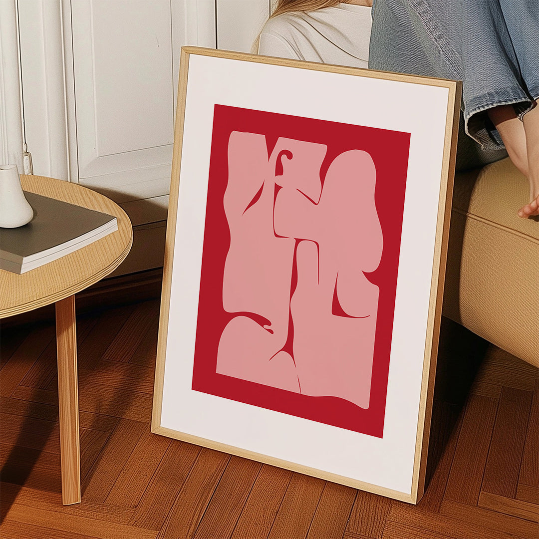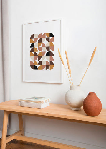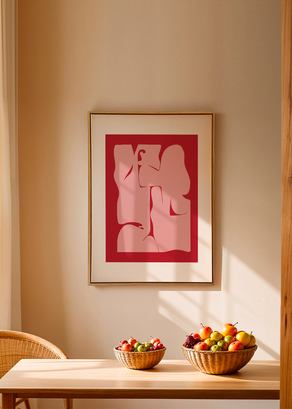 Beautiful poster from the geometric wall art and prints series, an original by Nordic Creators, with shades of red, and in vertical position. The abstract, geometric shapes help create a casual, creative setting. A modern touch for your home. This piece includes a white strip framing the design to boost its style.