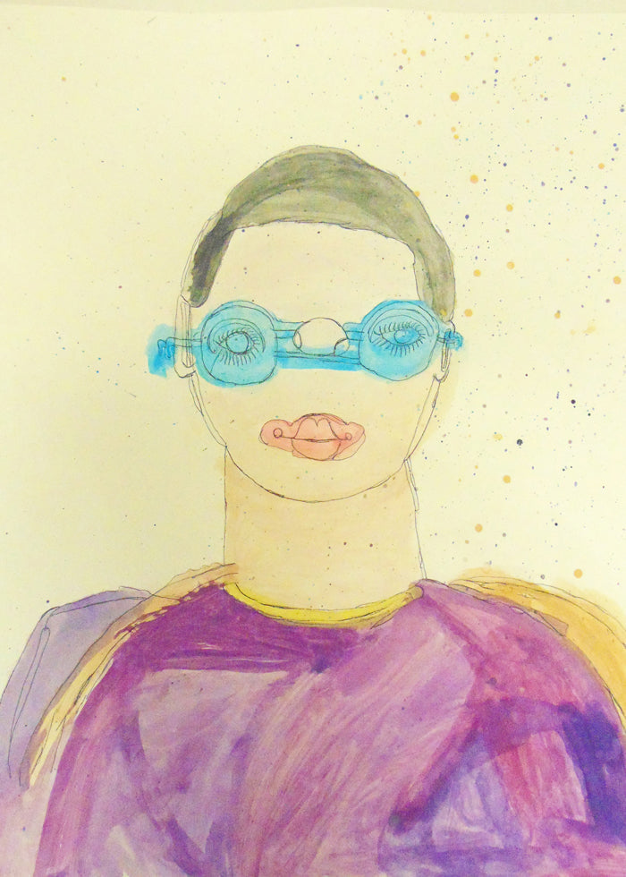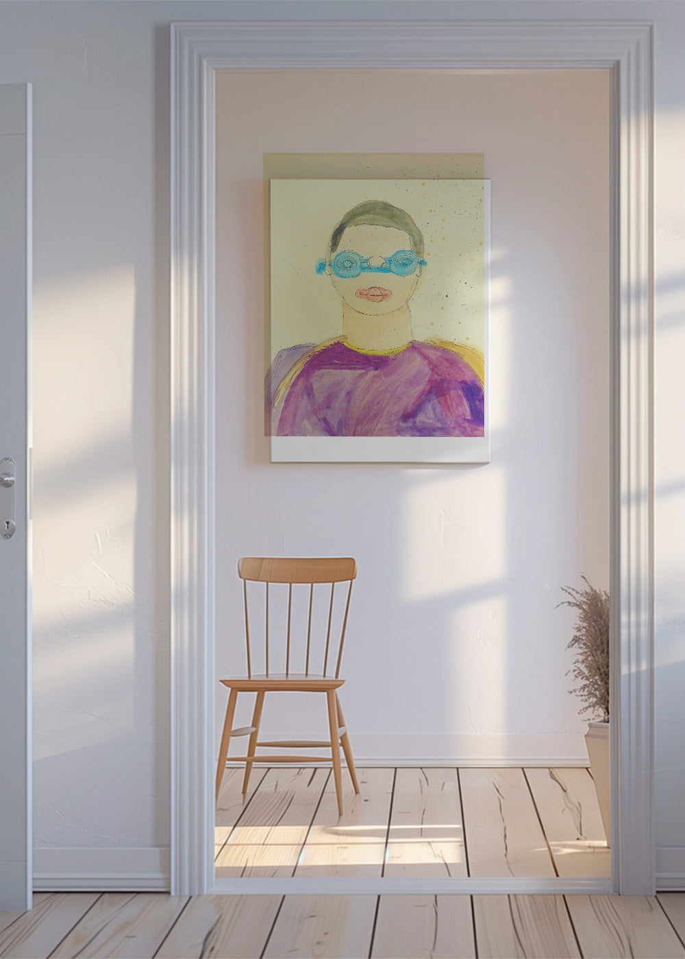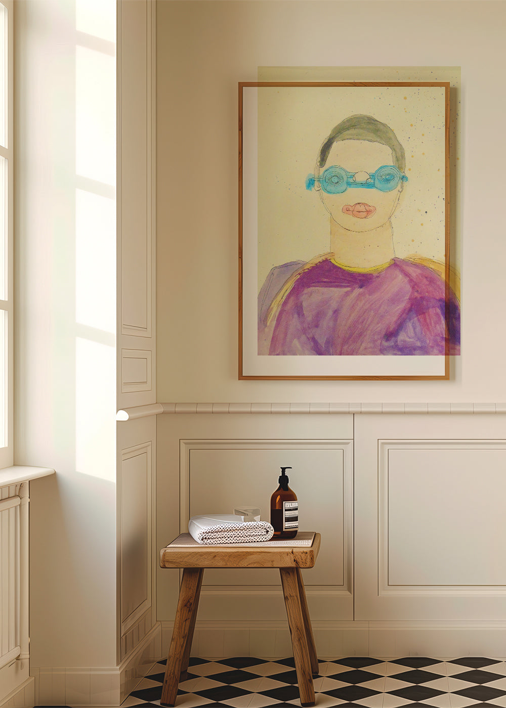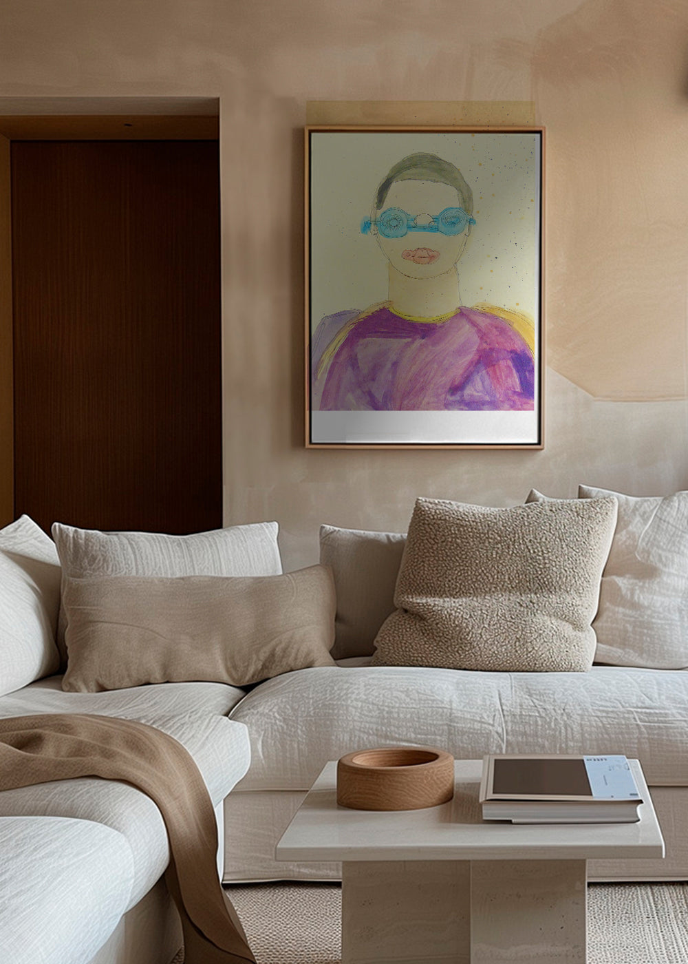 A piece from the portrait faces posters series, by José Maria Escobar, with purple, and facing vertically. Illustrated posters are the perfect way to fill your walls with creativity. Build a home full of design and creativity.
