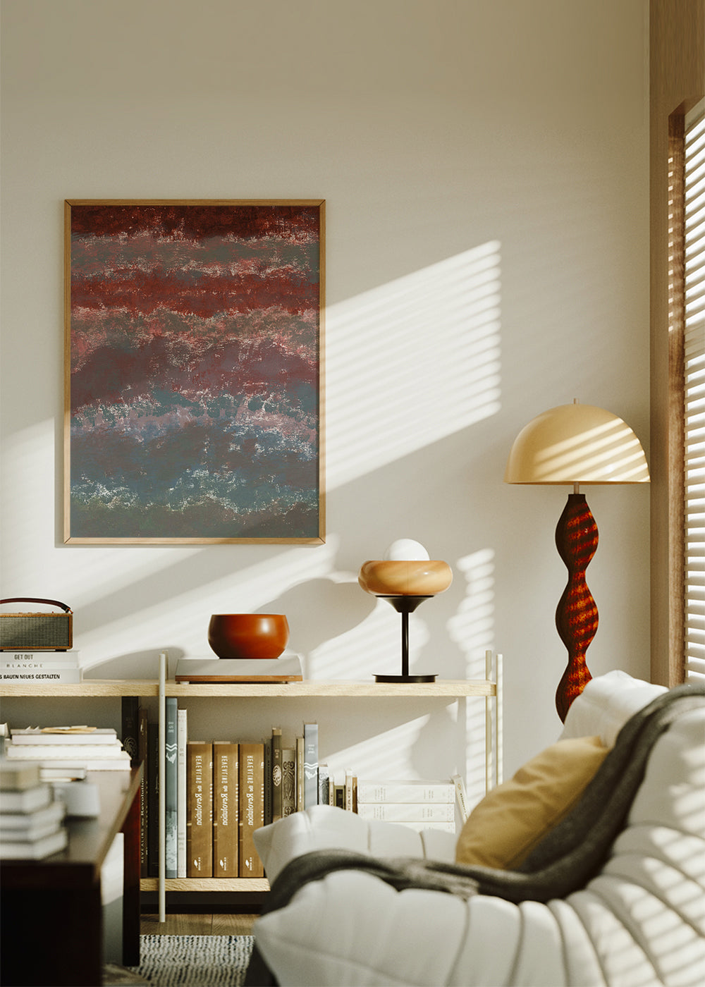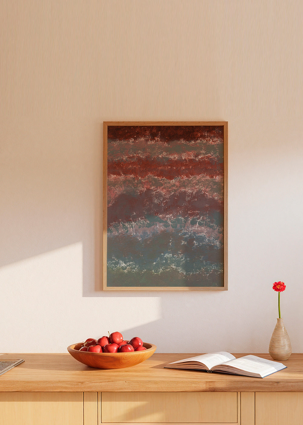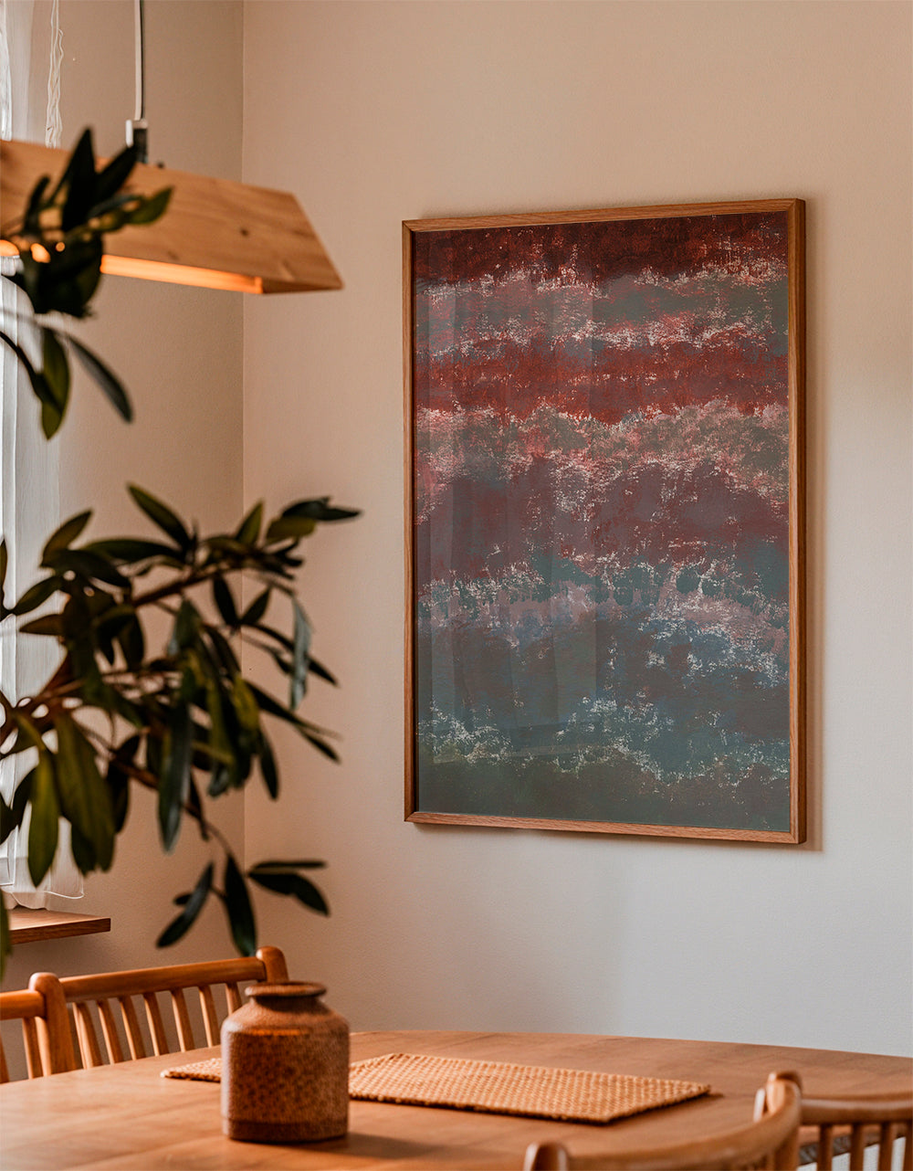 A piece from the abstract wall art and prints category, created by Elena Camacho Art, in red shades, and perfect to hang vertically. Decorating with abstract prints is a great option if you want a unique home. An empty wall is a sad wall; but with a few prints, we'll make it smile.