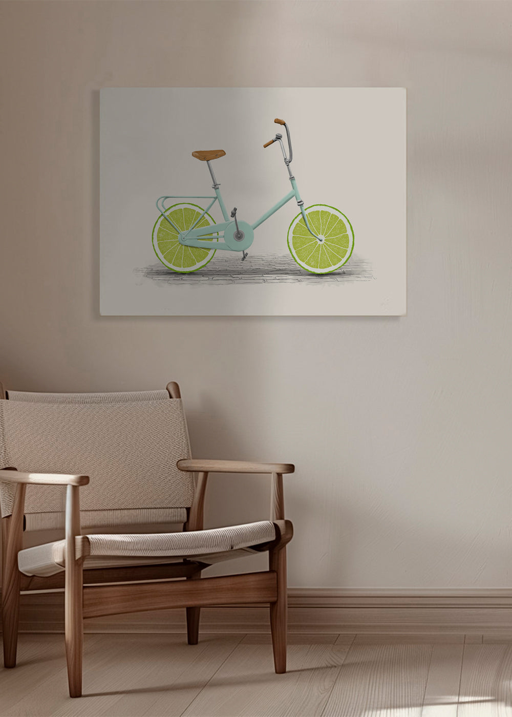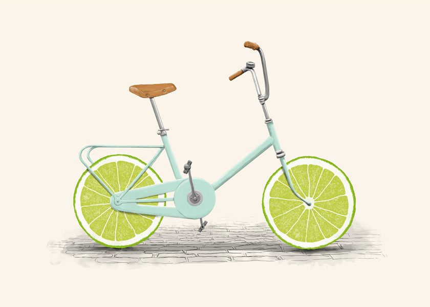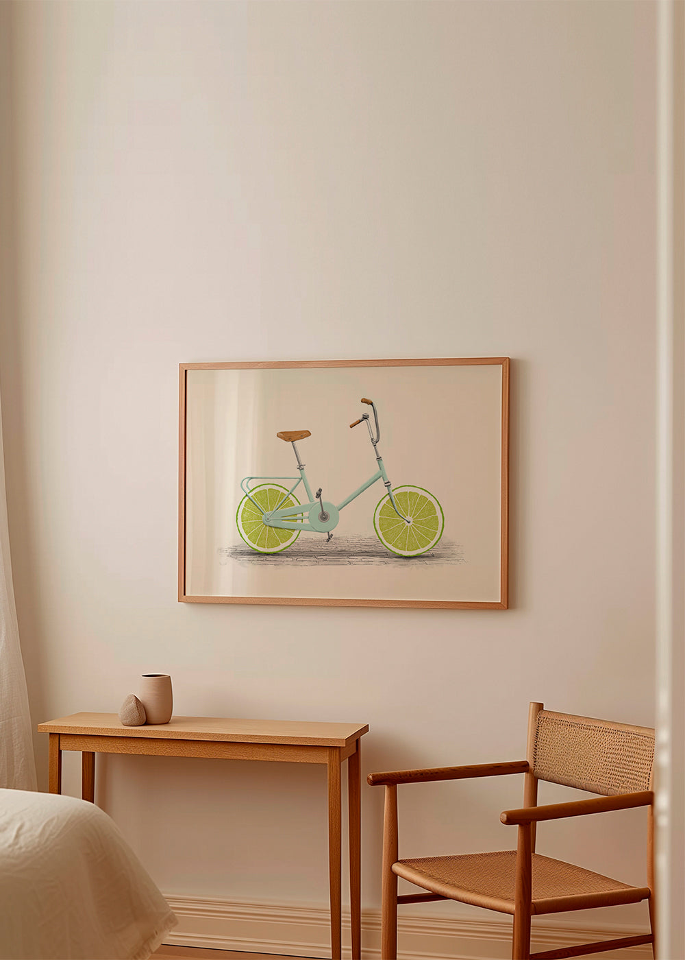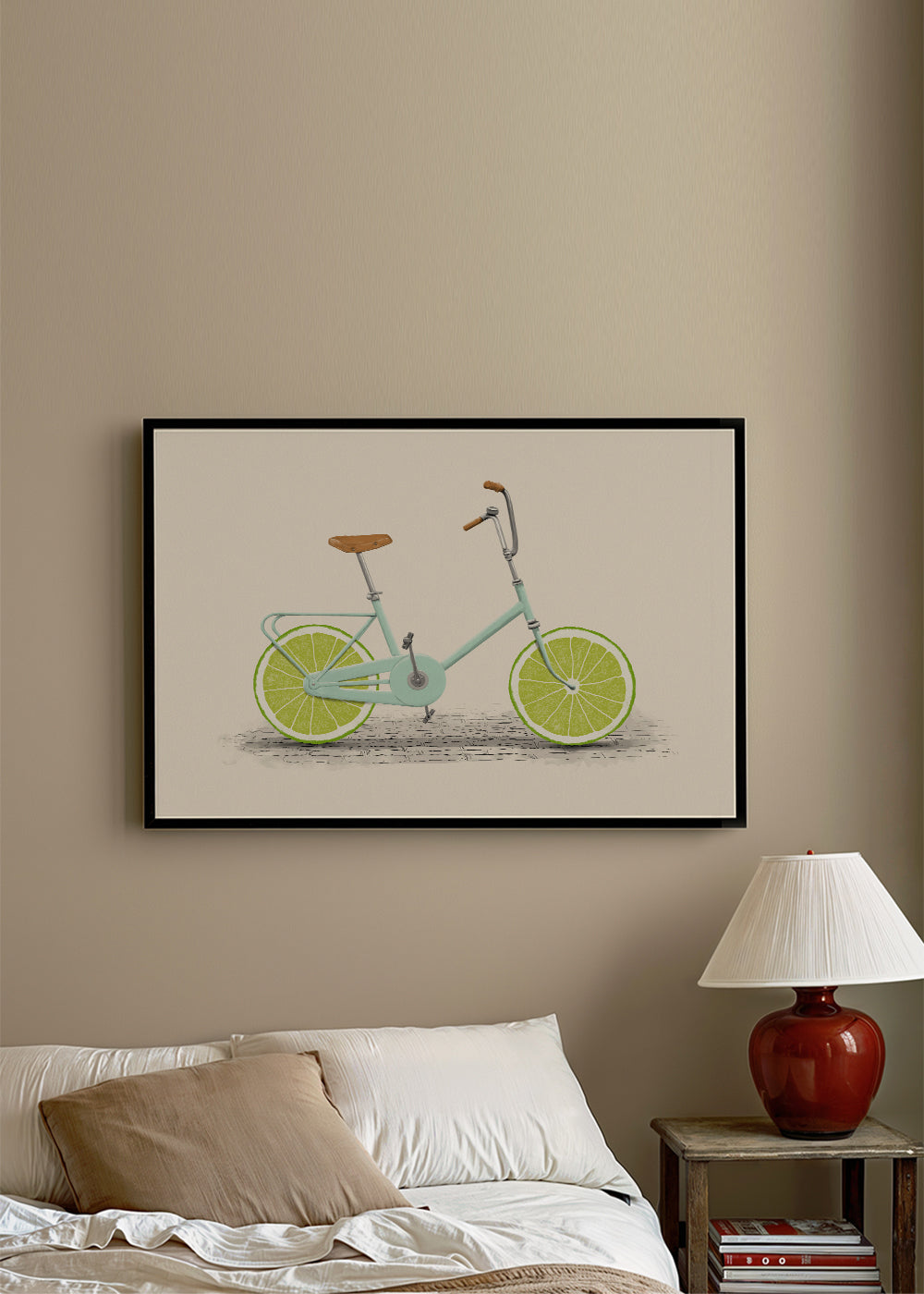 This print from our bicycle wall art series, by Florent Bodart, with shades of blue, and horizontal layout. Give your style a vintage touch by pairing this print with other retro-style posters. A modern touch for your home.