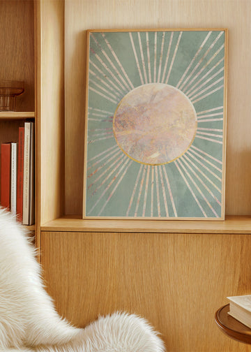 A print inspired by the collection of sunrise and sunset wall art, from the collection of the artist Sarah Manovski Art, with touches of green, and with vertical layout. Drawings are one of the clearest forms of art and this design will leave no one indifferent. Create special spaces.