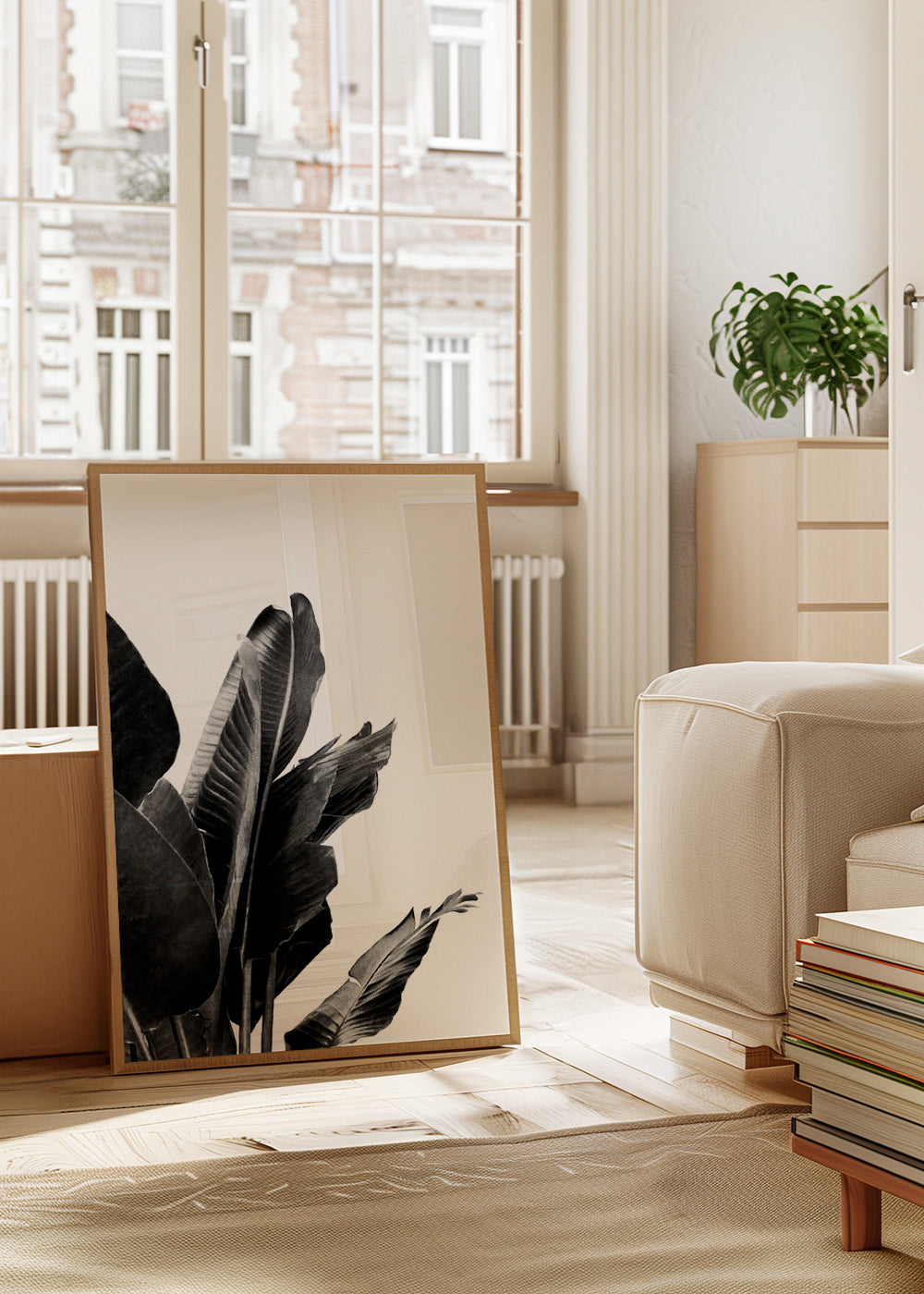 This print from our repertoire of palm tree prints, from the mind of amini54, with touches of black and white, and facing vertically. Decoration with botanical prints is perfect for nature-lovers. Let your walls tell a story.