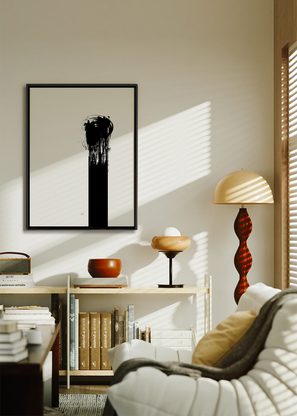 A design from our japanese wall art series, by creative artist Thoth Adan, in black and white shades, and vertical layout. The abstract, geometric shapes help create a casual, creative setting. Transform your spaces with art.