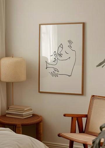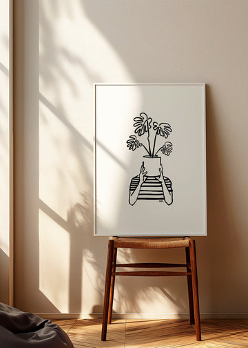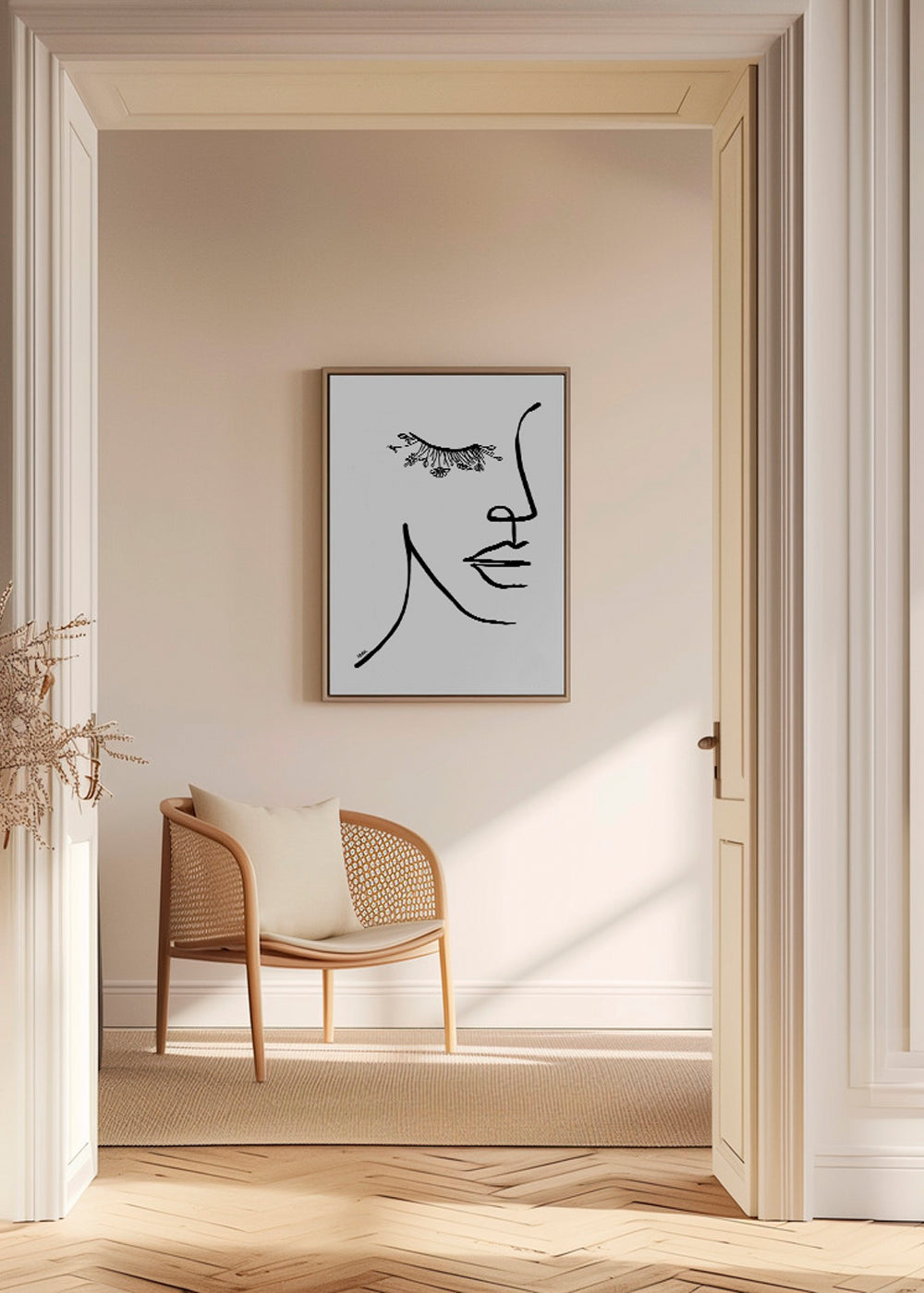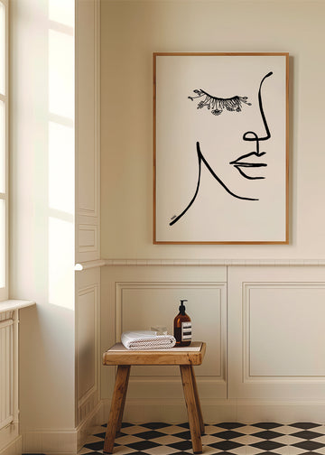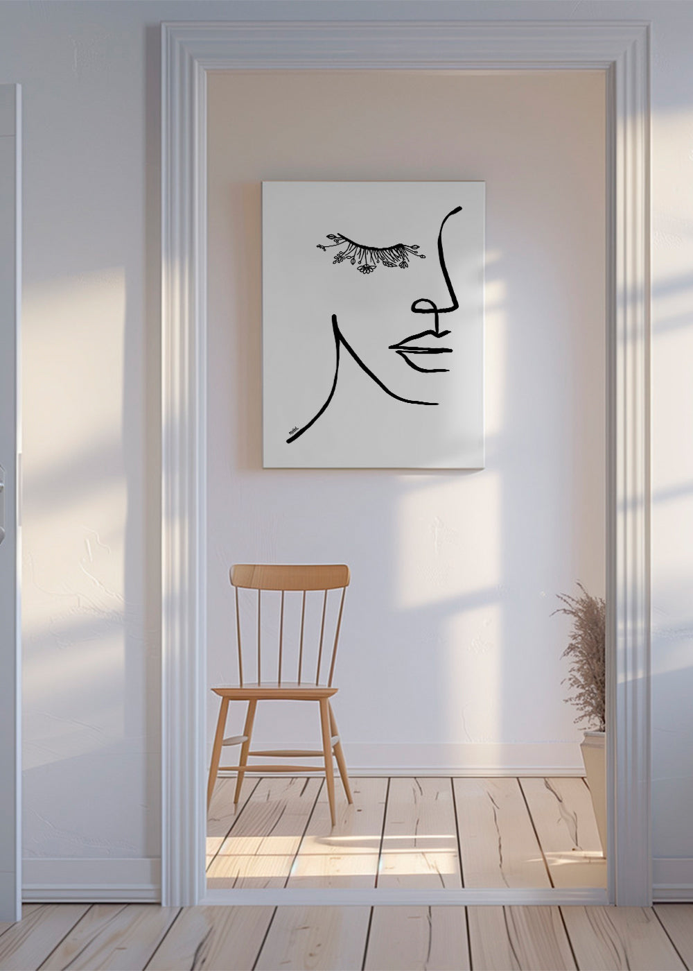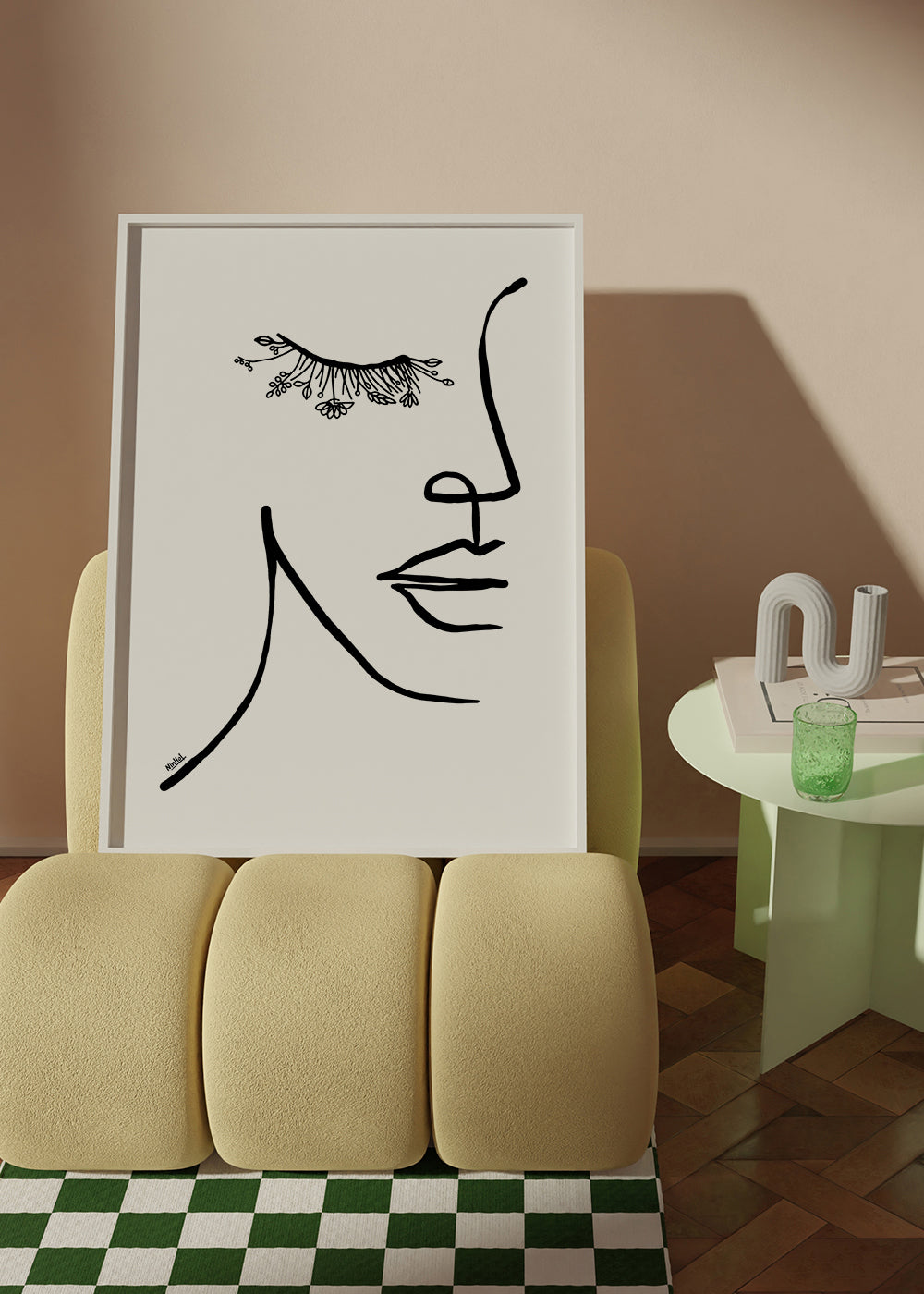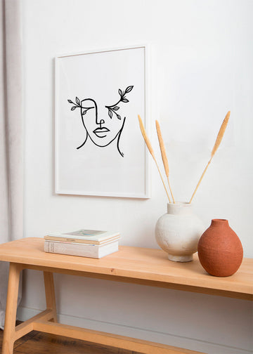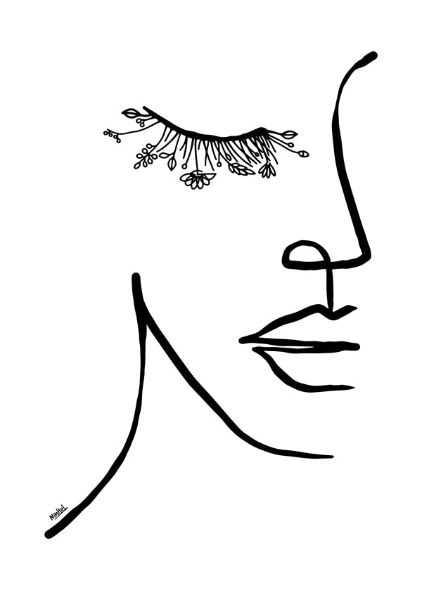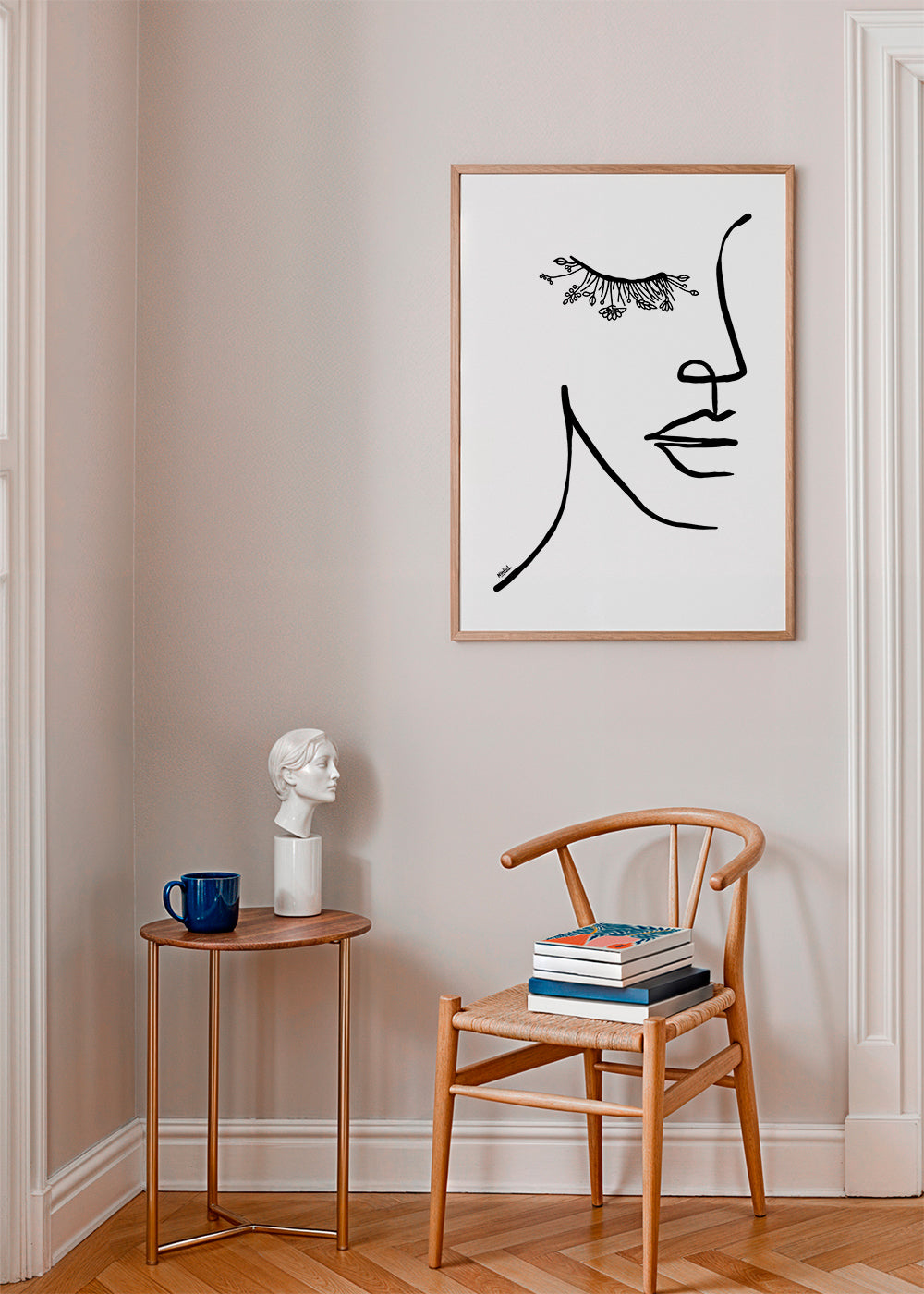 A poster in the style of our portrait faces posters, from the collection of the artist Ninhol, with black and white, and facing vertically. The drawing is simple and clean, so you can pair it with other illustrations for an artistic composition. Add a bit of art to your home decor.