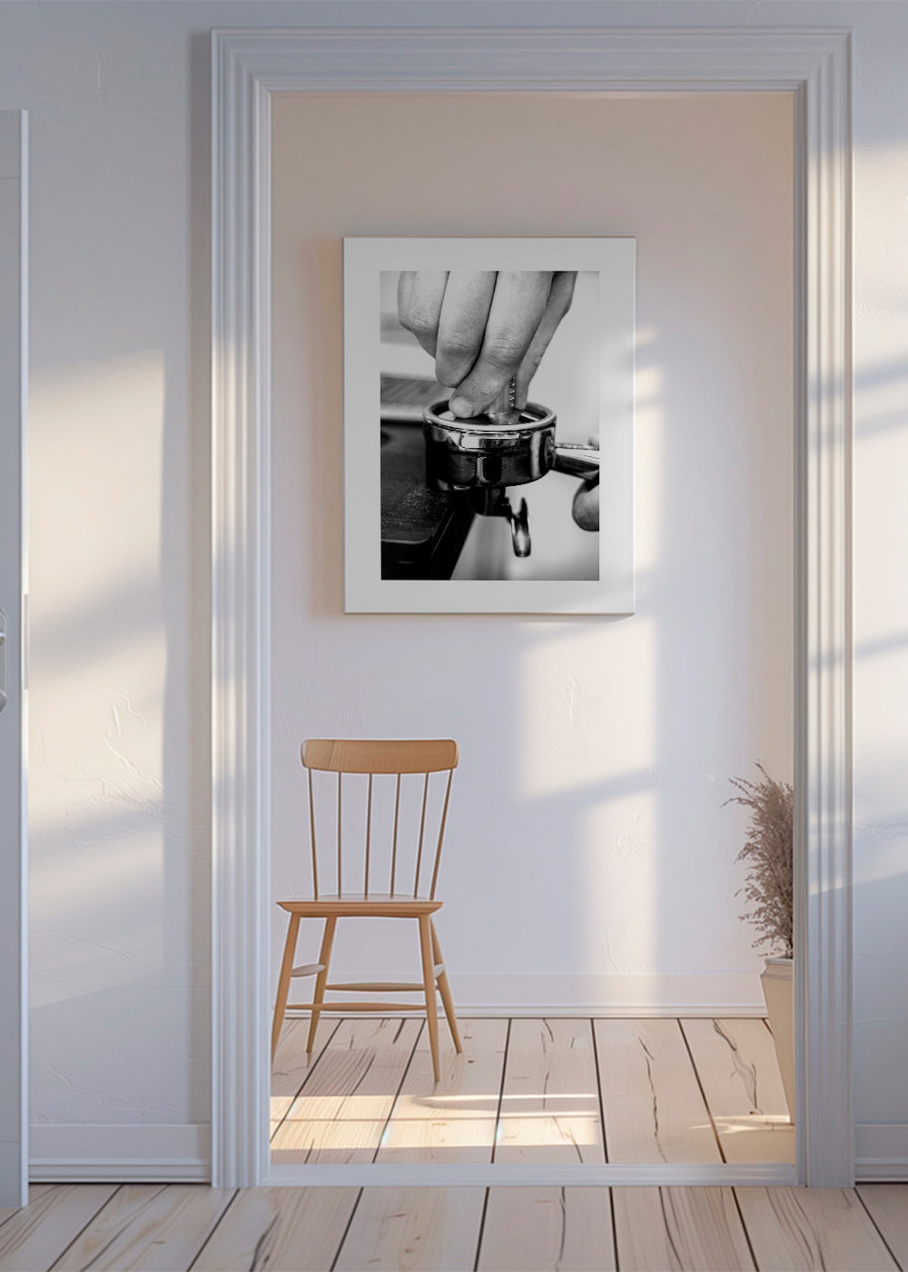 A poster from our coffee wall art collection, in tones of black and white, and with vertical layout. This photo is a perfect option to pair with other photo prints and create a gallery wall. Choose the size that best fits your decor. This design includes a white strip around it to add contrast to the piece.
