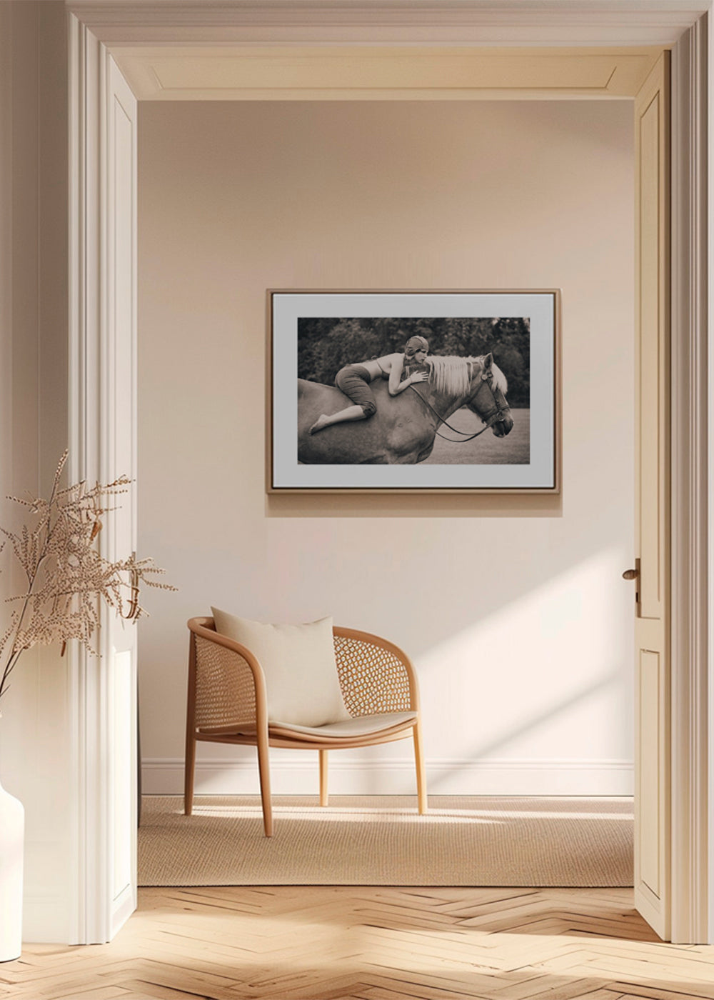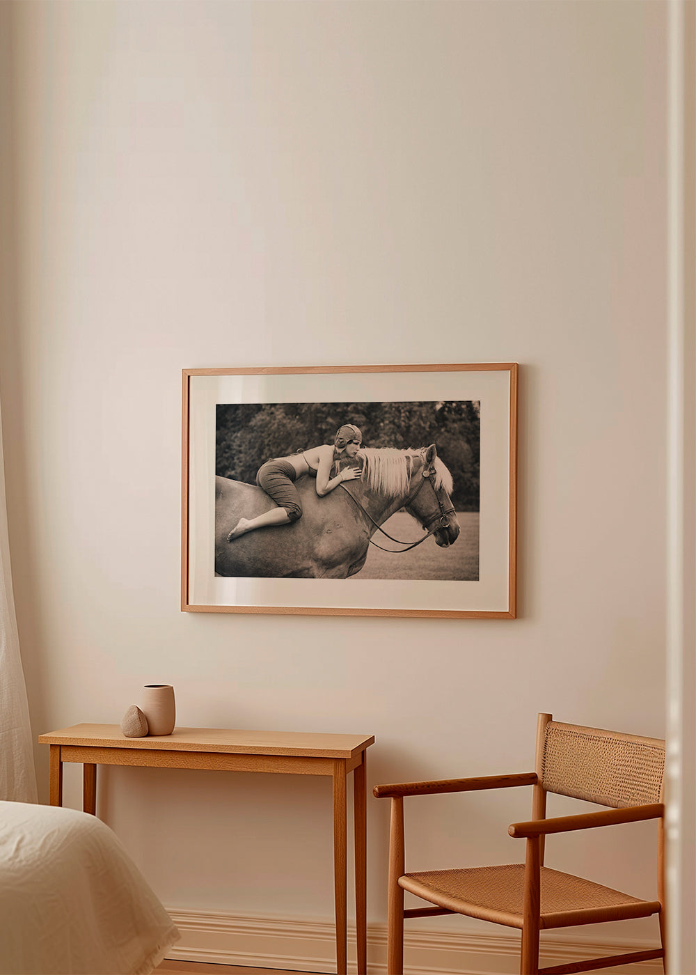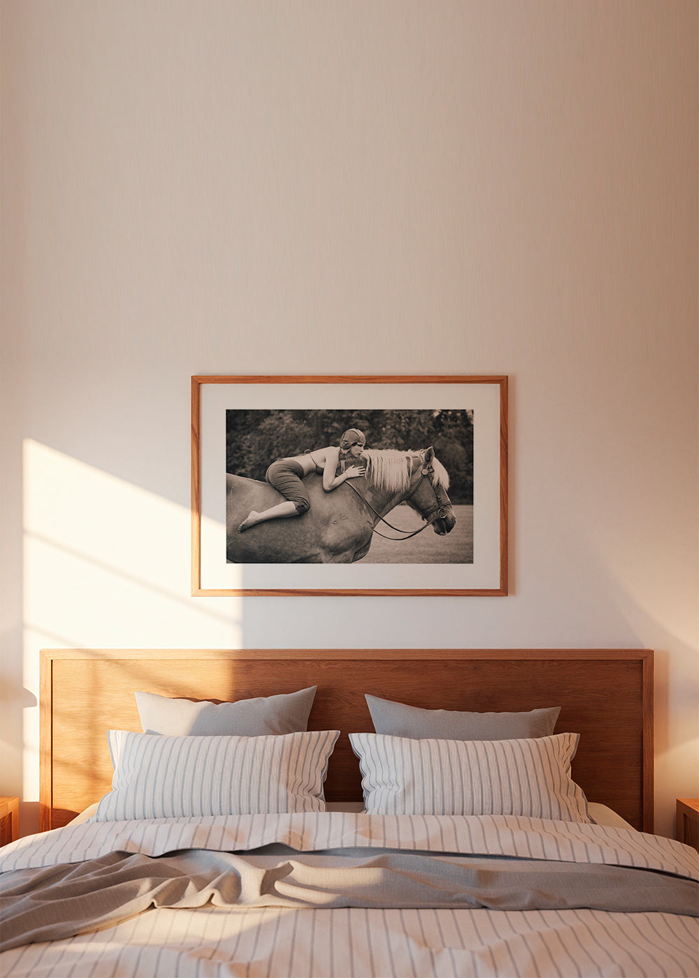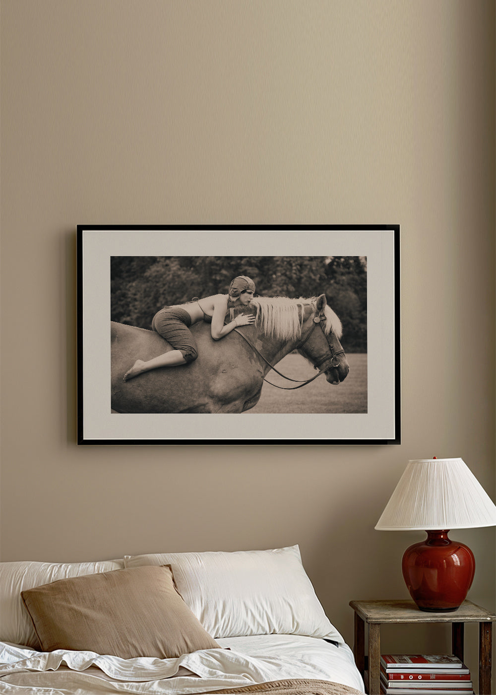 Beautiful piece from the horses wall art category, with black and white pigments, and in horizontal position. A retro poster you can pair with other vintage-style prints for an original touch in the home. Walls full of creativity. This design includes a white strip around it to add contrast to the piece.