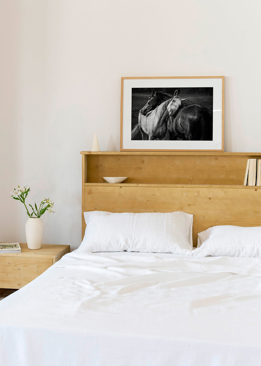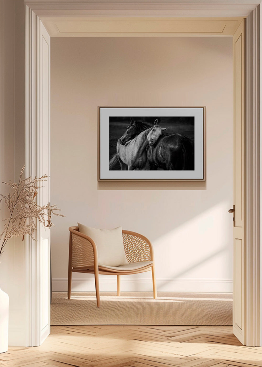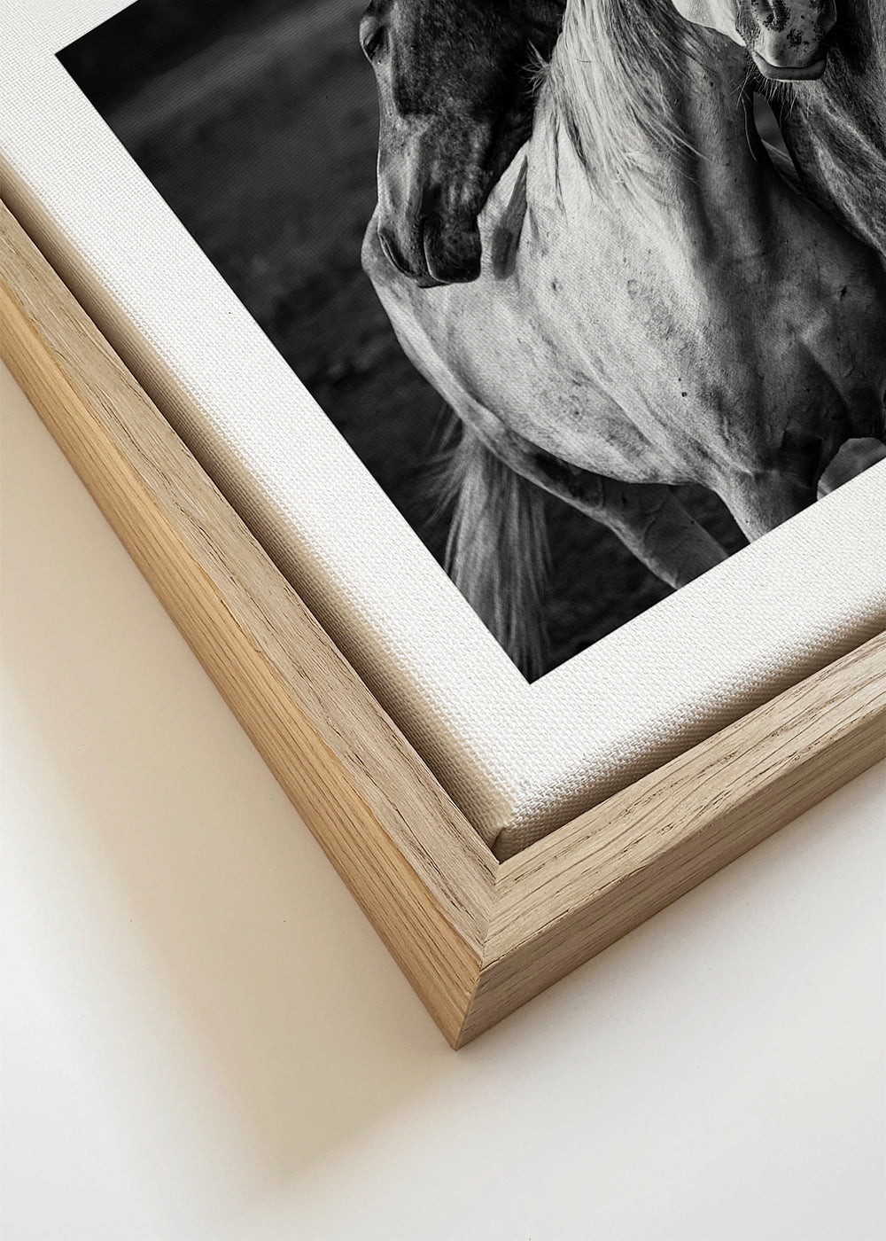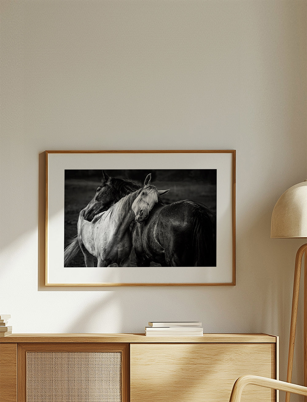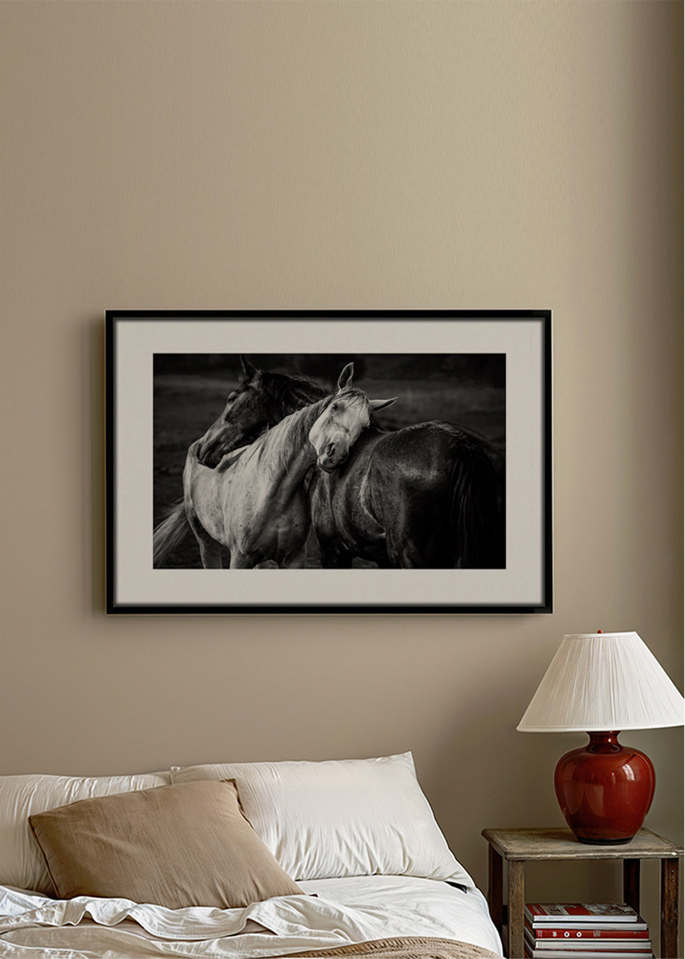 A print from the horses wall art series, with tones of black and white, and to hang in horizontal position. Animal prints let you show your wild side through your wall decoration. The difference is in the details. This piece includes a white strip framing the design to boost its style.