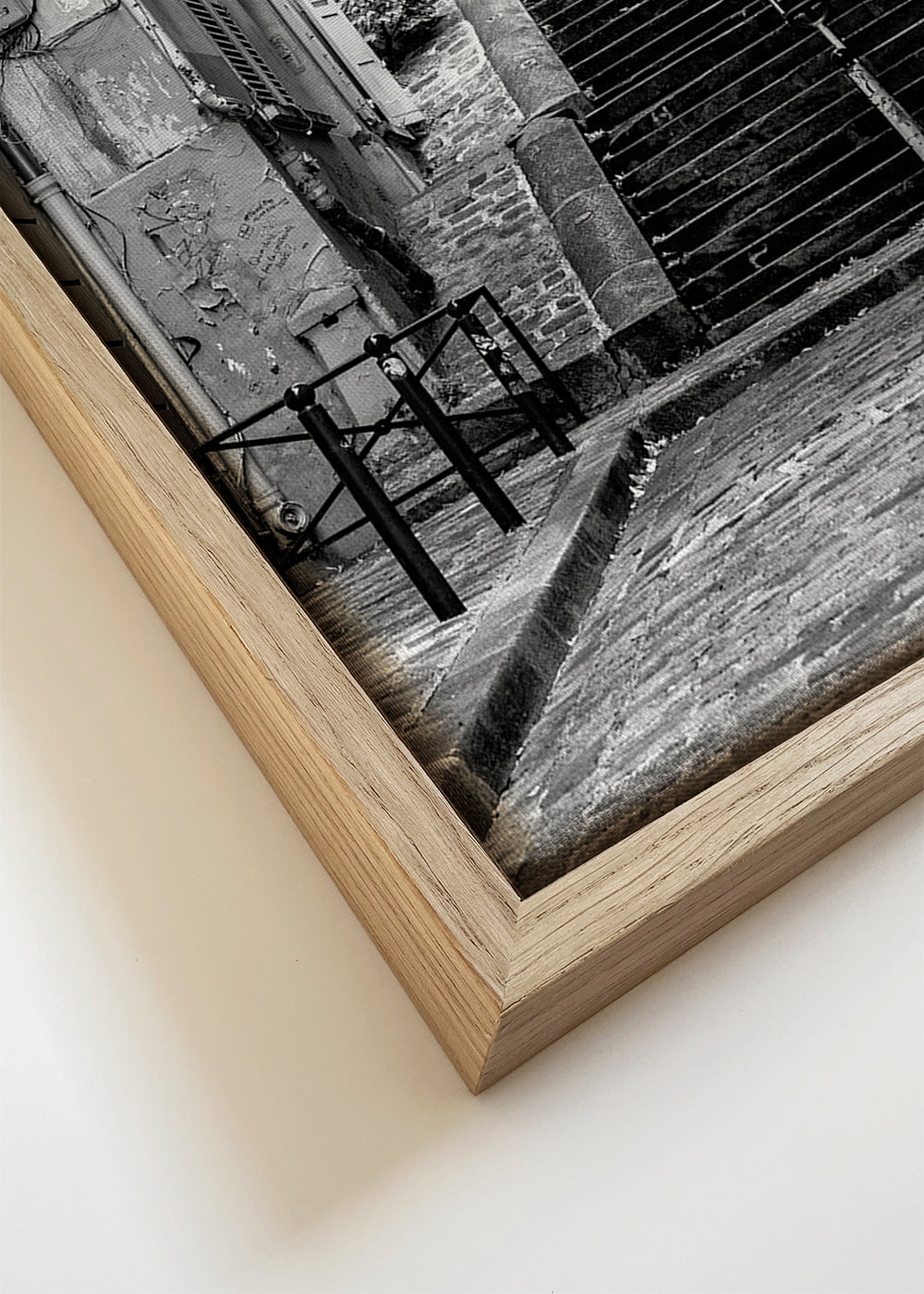 We work with solid wood and aluminum frames. All framed artworks are shipped already assembled and ready to hang. The front protection is high-clarity acrylic glass.