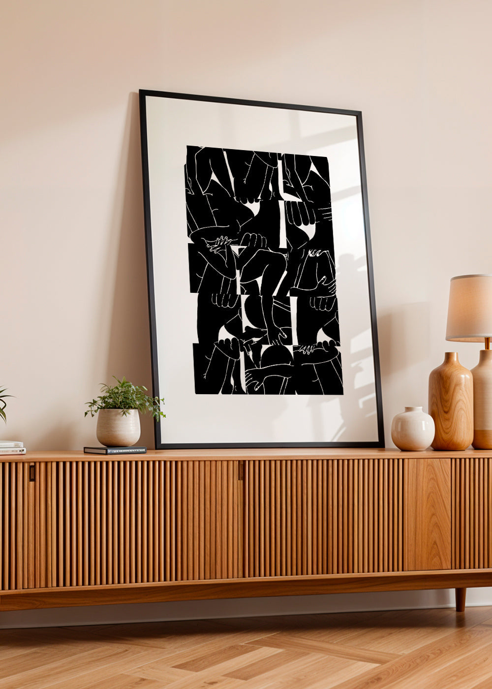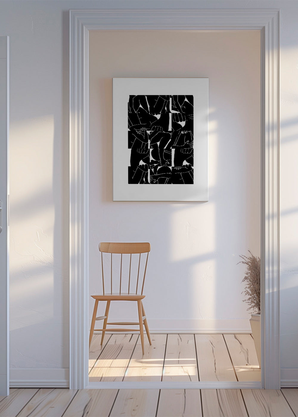 A print from the geometric wall art and prints series, created by Nordic Creators, in tones of black and white, and in vertical position. Geometric art is an elegant style to decorate the walls of your home with. Walls full of creativity.