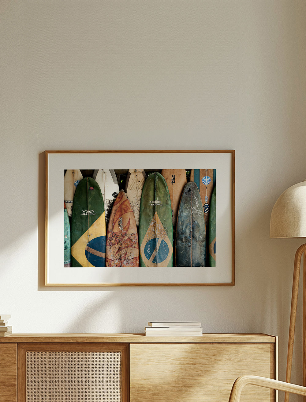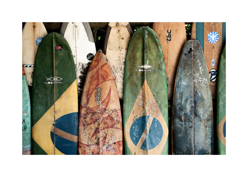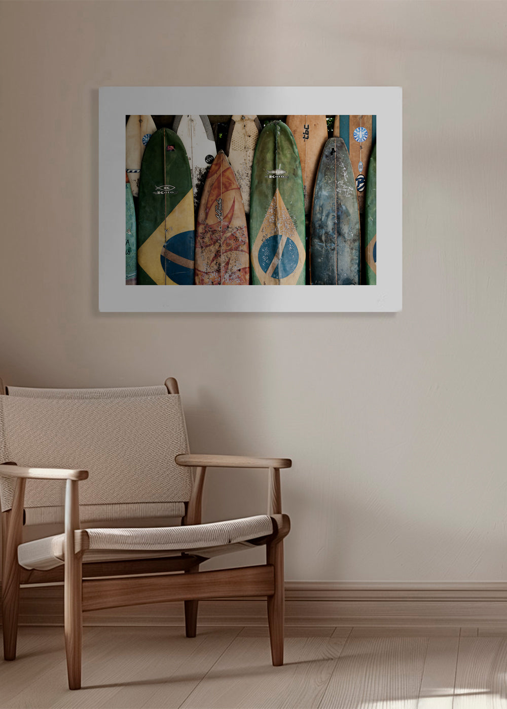 Beautiful poster from our repertoire of surf posters and wall art, by creative artist Ferran Feixas, with tones of green, and with horizontal layout. Landscape decoration brings a breath of fresh air to any room. Build a home full of design and creativity. The white strip around the piece enhances its expressiveness.
