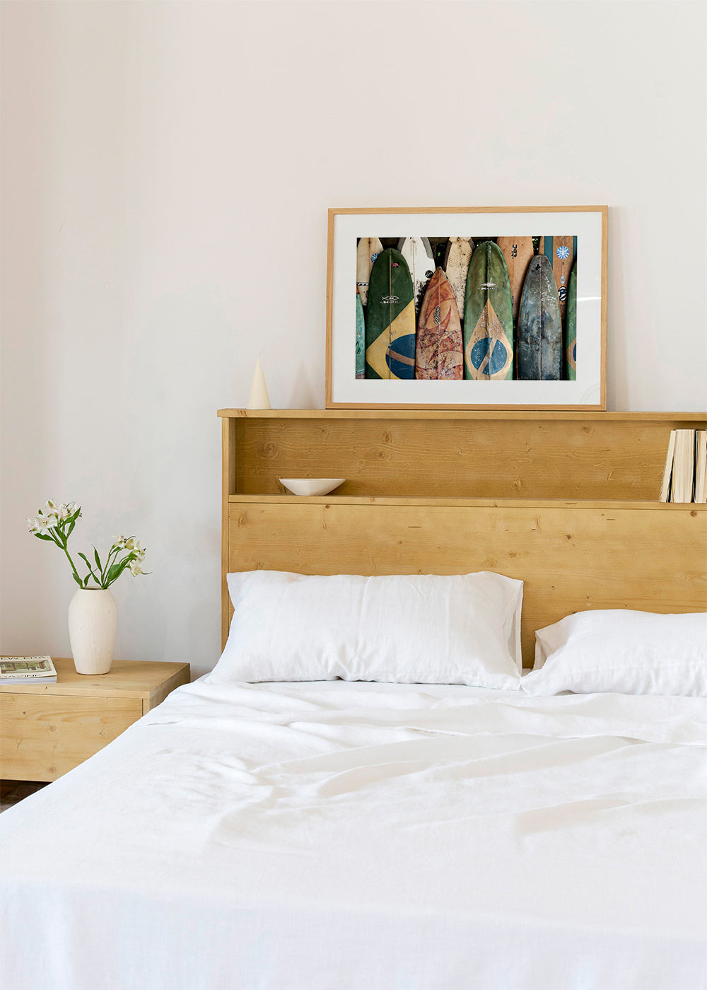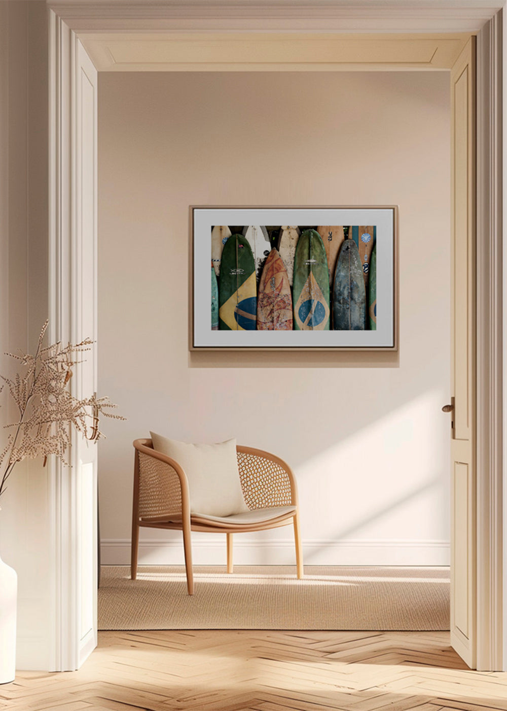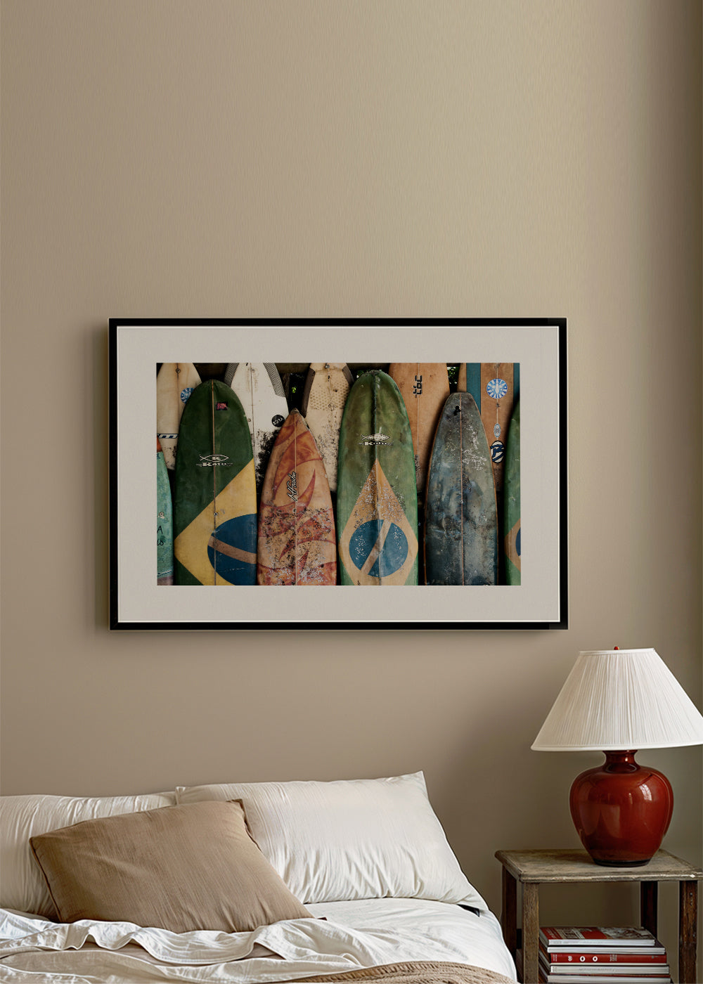 Beautiful poster from our repertoire of surf posters and wall art, by creative artist Ferran Feixas, with tones of green, and with horizontal layout. Landscape decoration brings a breath of fresh air to any room. Build a home full of design and creativity. The white strip around the piece enhances its expressiveness.