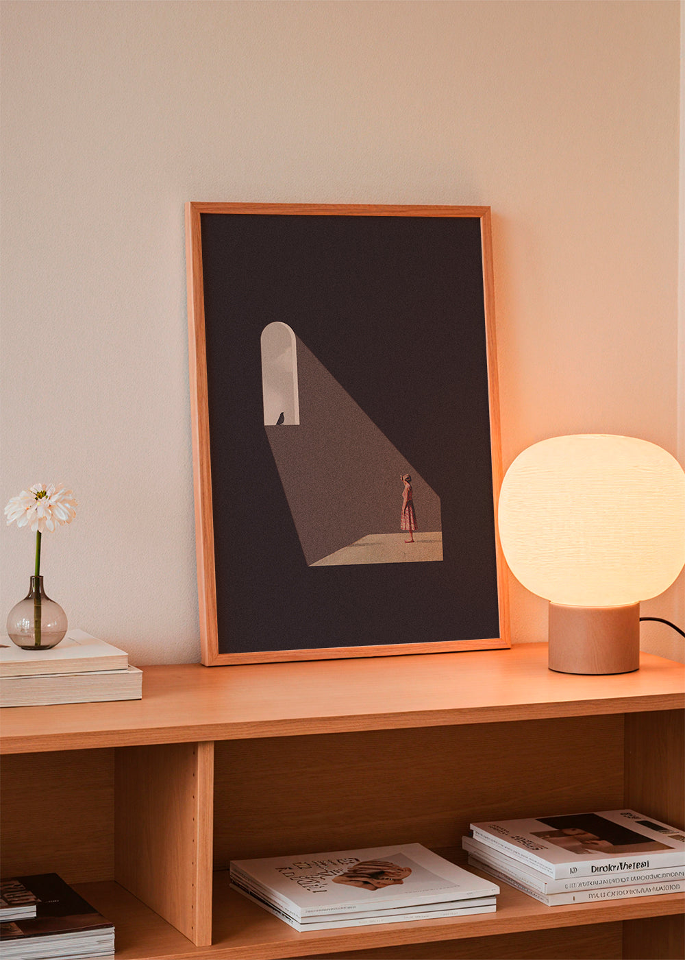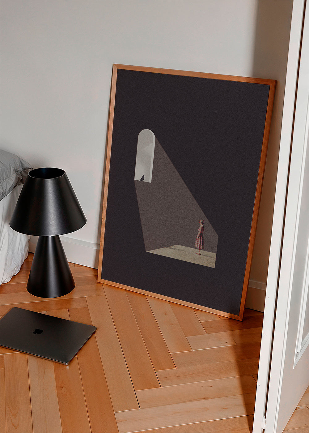 We work with solid wood and aluminum frames. All framed artworks are shipped already assembled and ready to hang. The front protection is high-clarity acrylic glass.