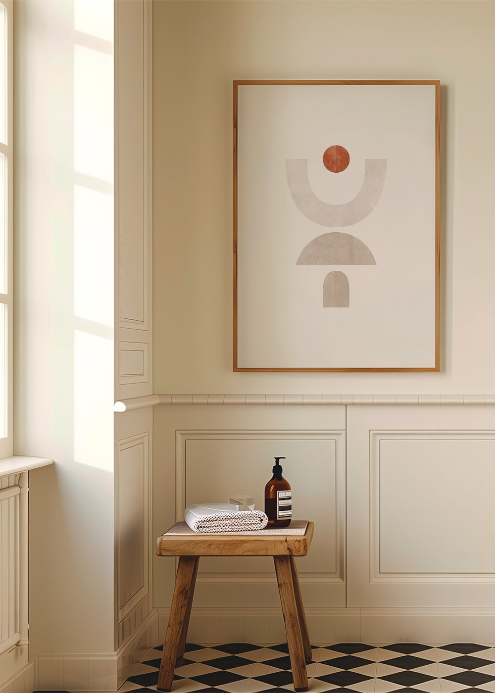 A piece from the geometric wall art and prints category, created by Kookie Pixel, with red pigments, and facing vertically. The abstract, geometric shapes help create a casual, creative setting. Transform your spaces with art.