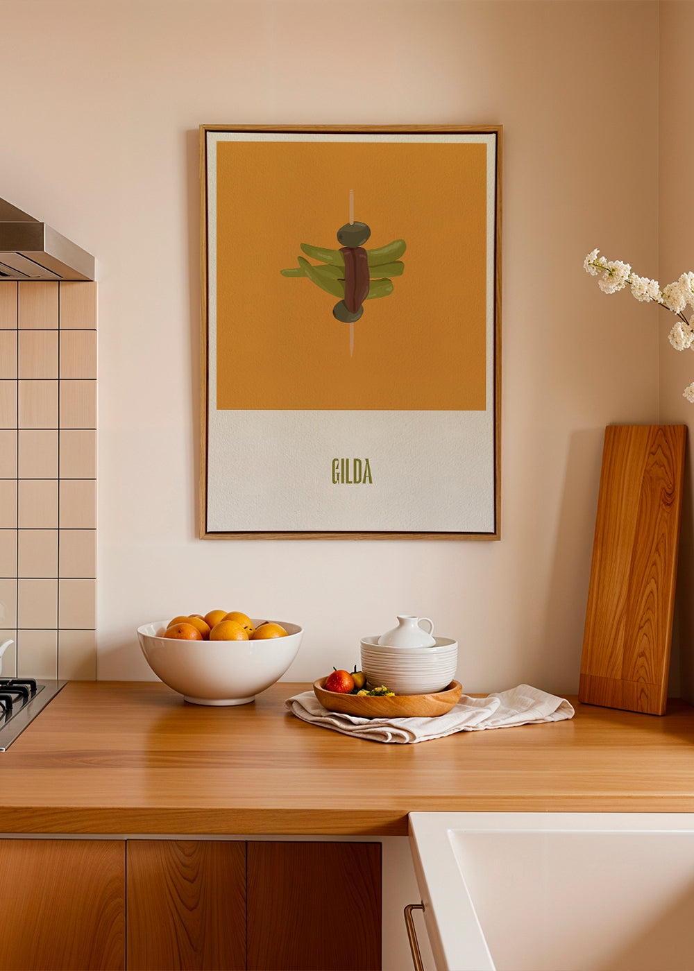 A piece in the style of our food posters, an original by Nerea Ramírez, with tones of orange, and perfect to hang vertically. The kitchen can be a cosy spot, too, if you pair this design with other kitchen prints for a super chic kitchen. Fill your decoration with art.