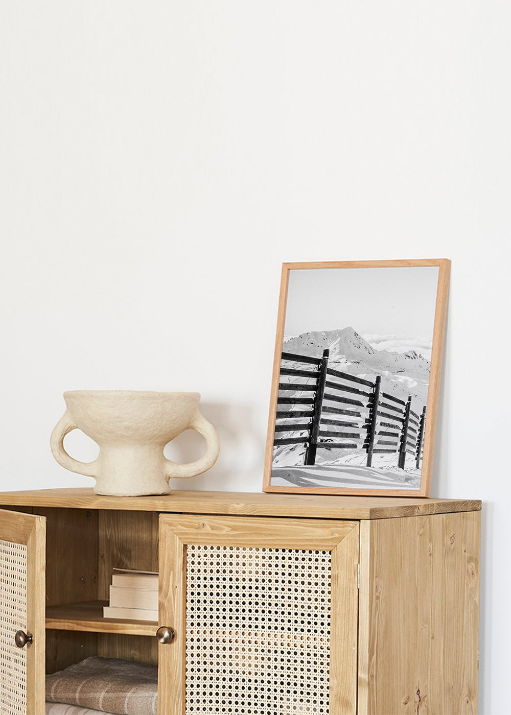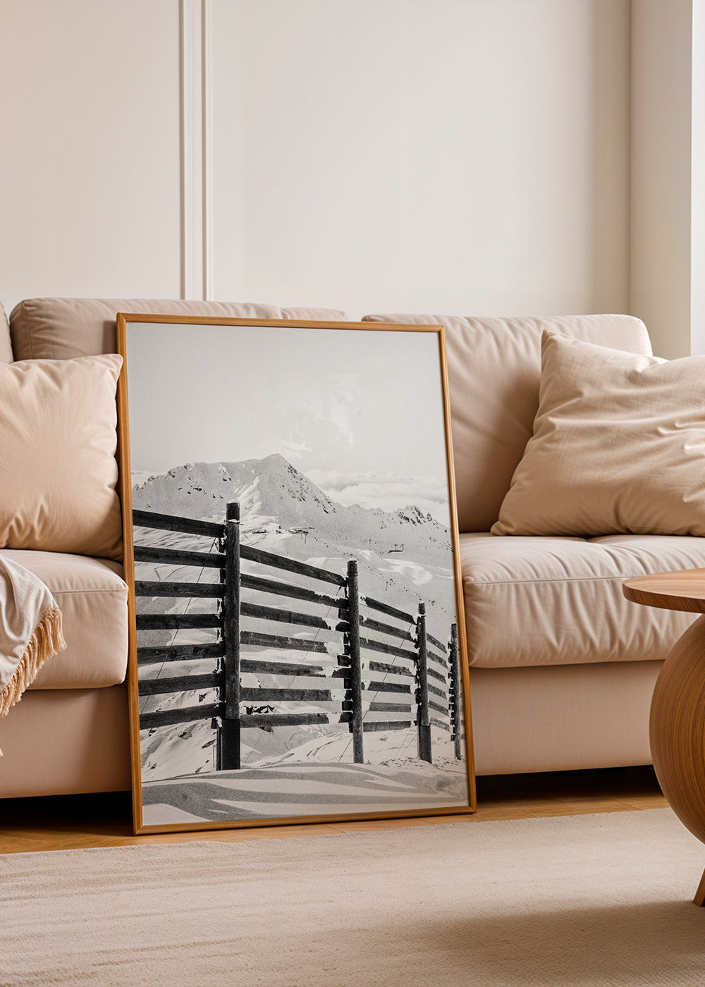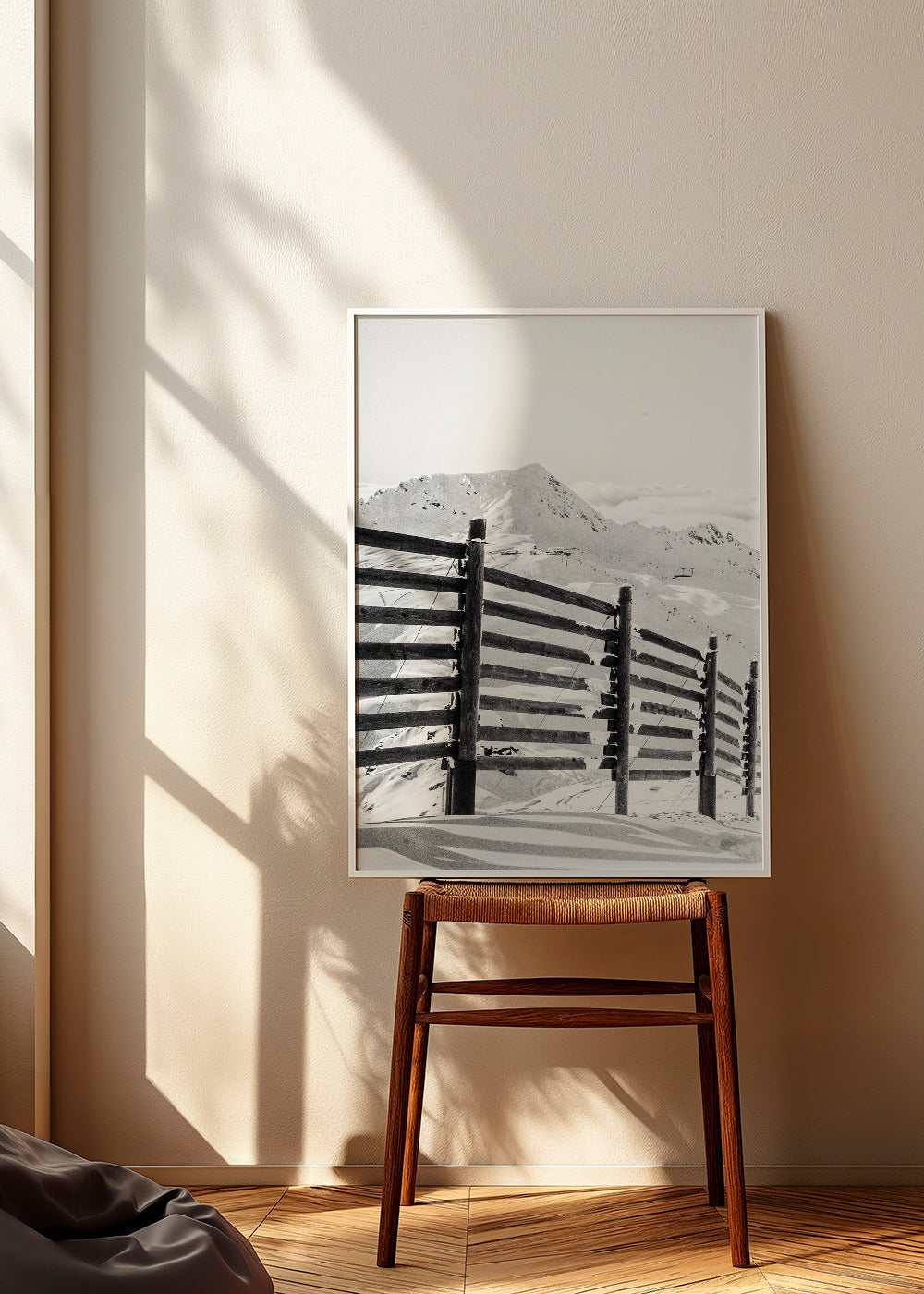 A poster from the snow prints and wall art series, made by Victoria Frost, with touches of black, and with vertical layout. A beautiful landscape perfect for pairing with other nature prints. A piece that will be a plus for any room.