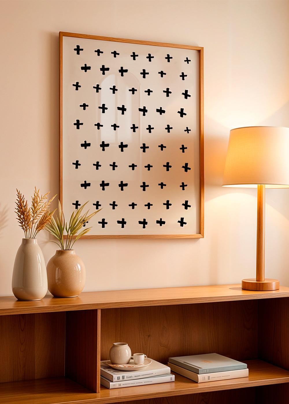 A print in the style of our pattern wall art, from the collection of the artist Kookie Pixel, with black tones, and with vertical layout. The abstract, geometric shapes help create a casual, creative setting. Choose the size that best fits your decor.