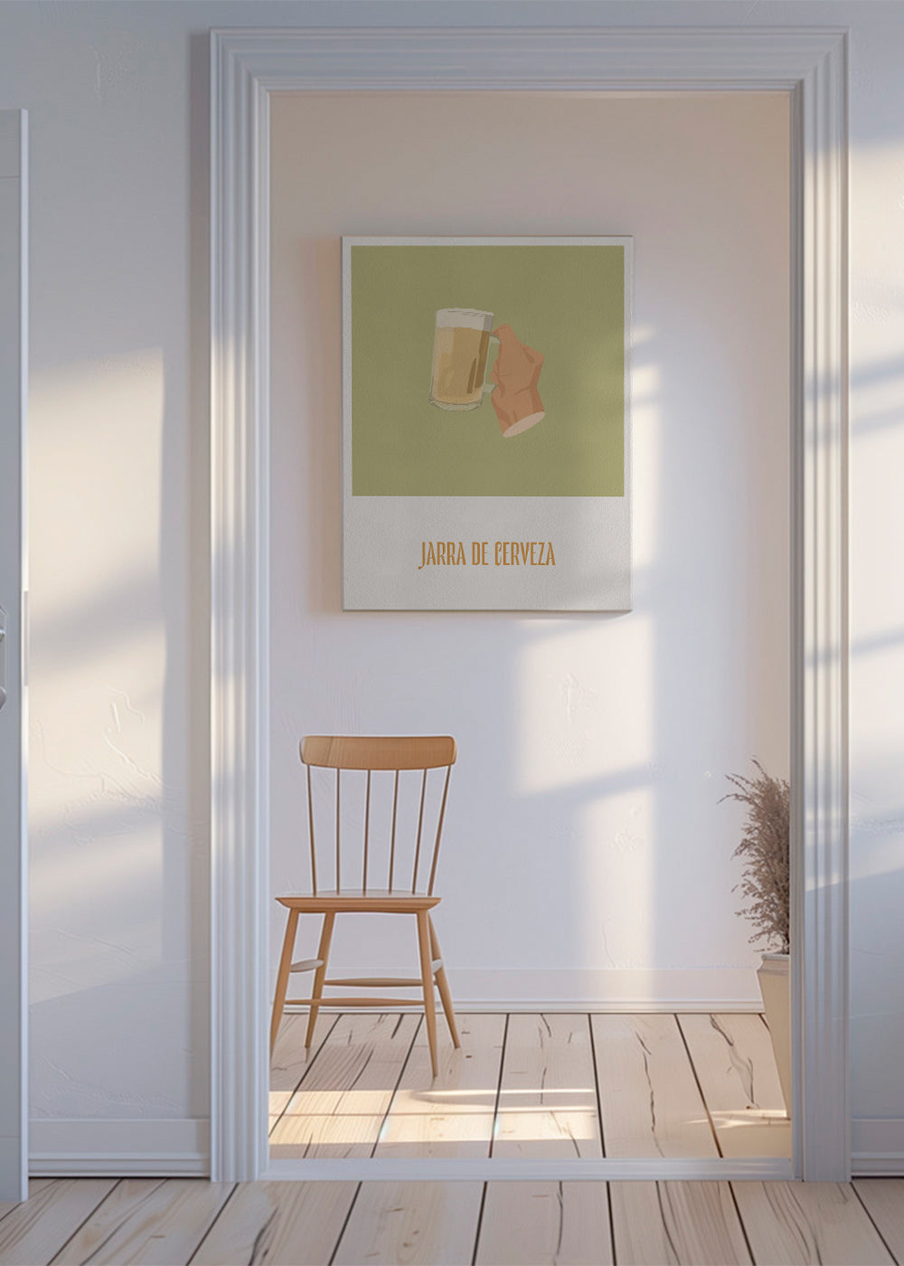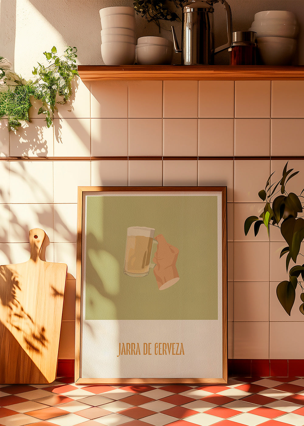 Beautiful design from our beer wall art category, from the collection of the artist Nerea Ramírez, with shades of green, and vertical layout. Make your kitchen a fun space with this and other prints for the kitchen. Fill your decoration with art.