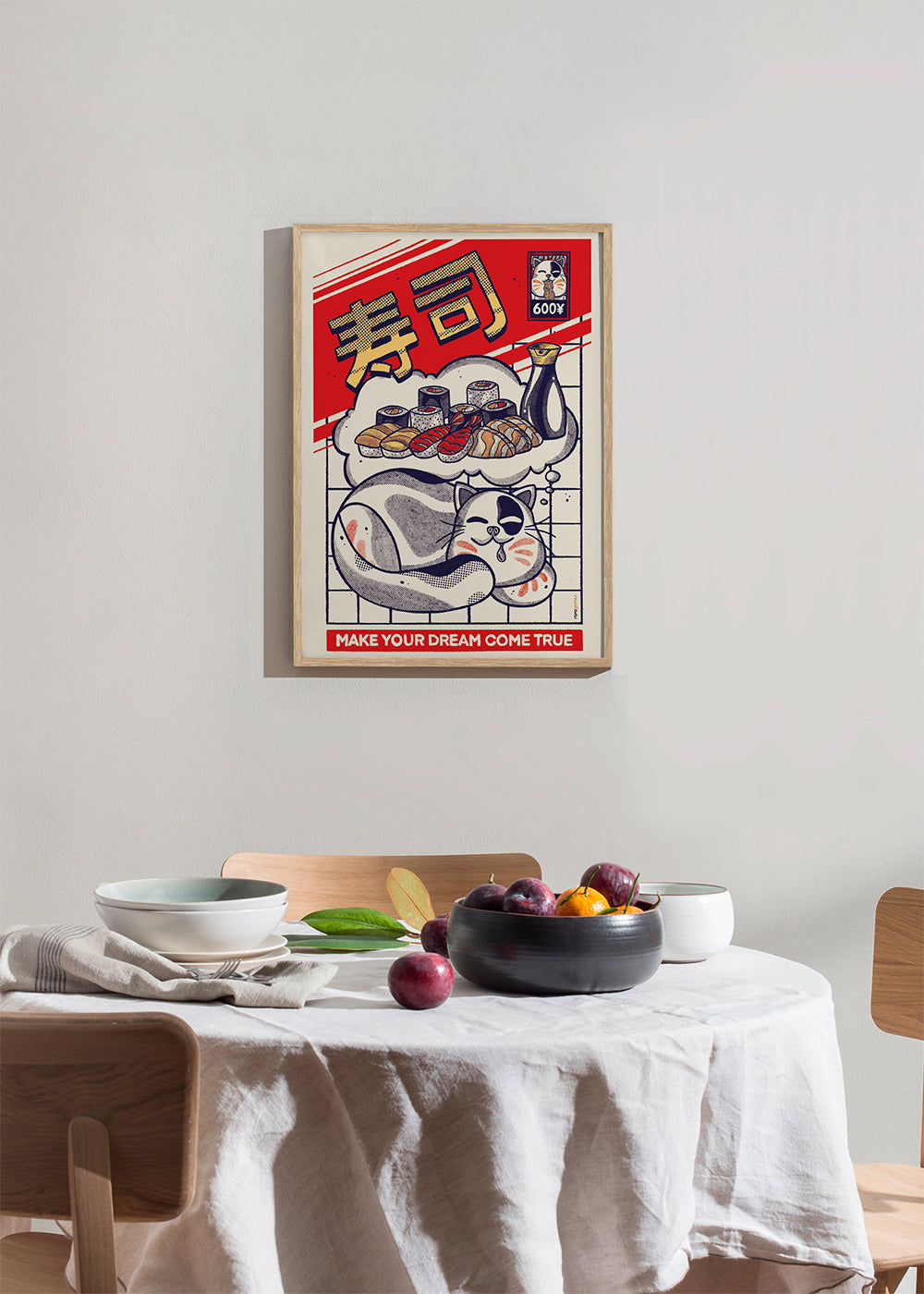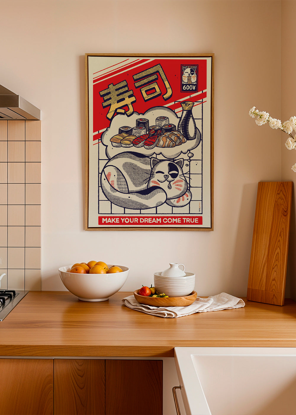 A poster from the japanese wall art series, by Rafa Gomes, with red tones, and perfect to hang vertically. A retro style that is perfect for a vintage look. Fill your walls with prints.