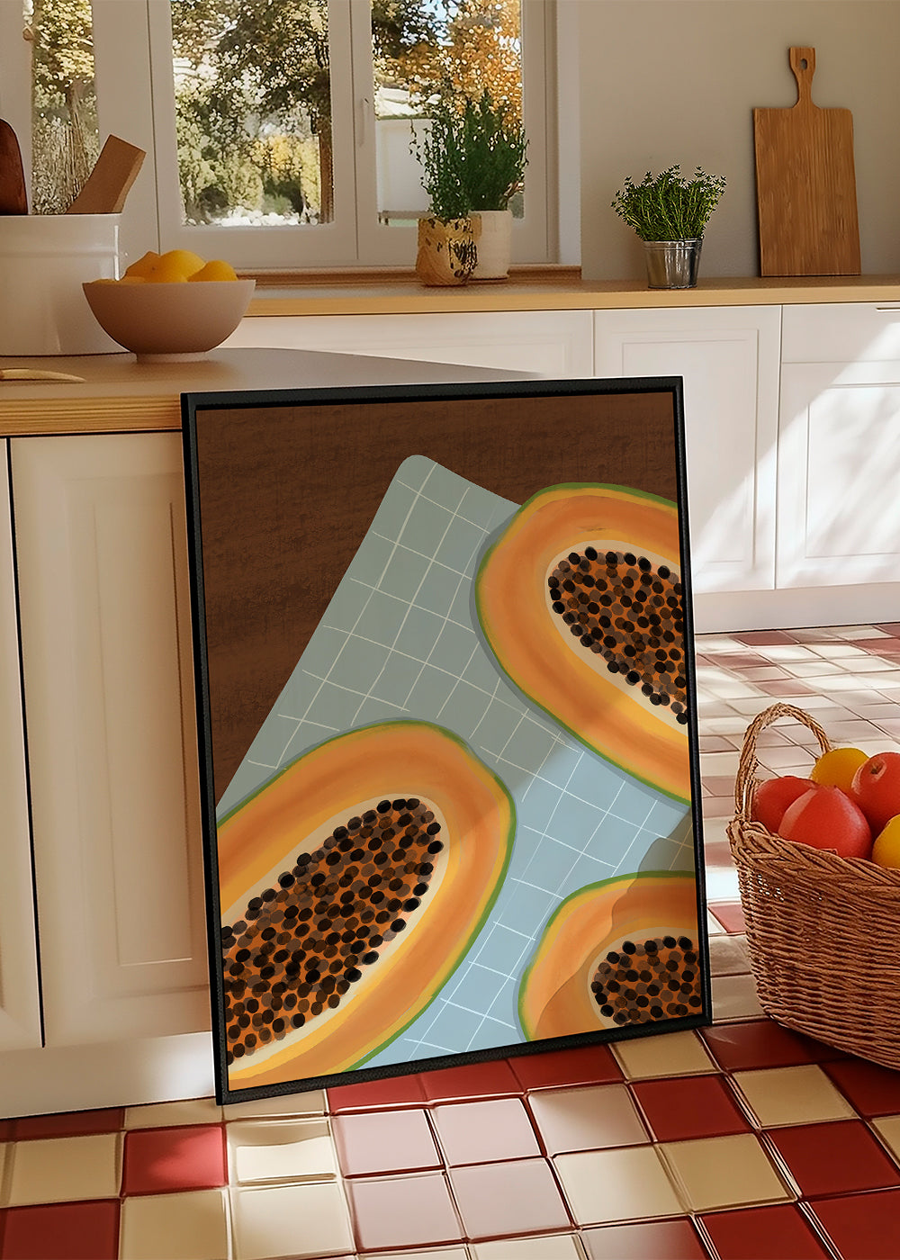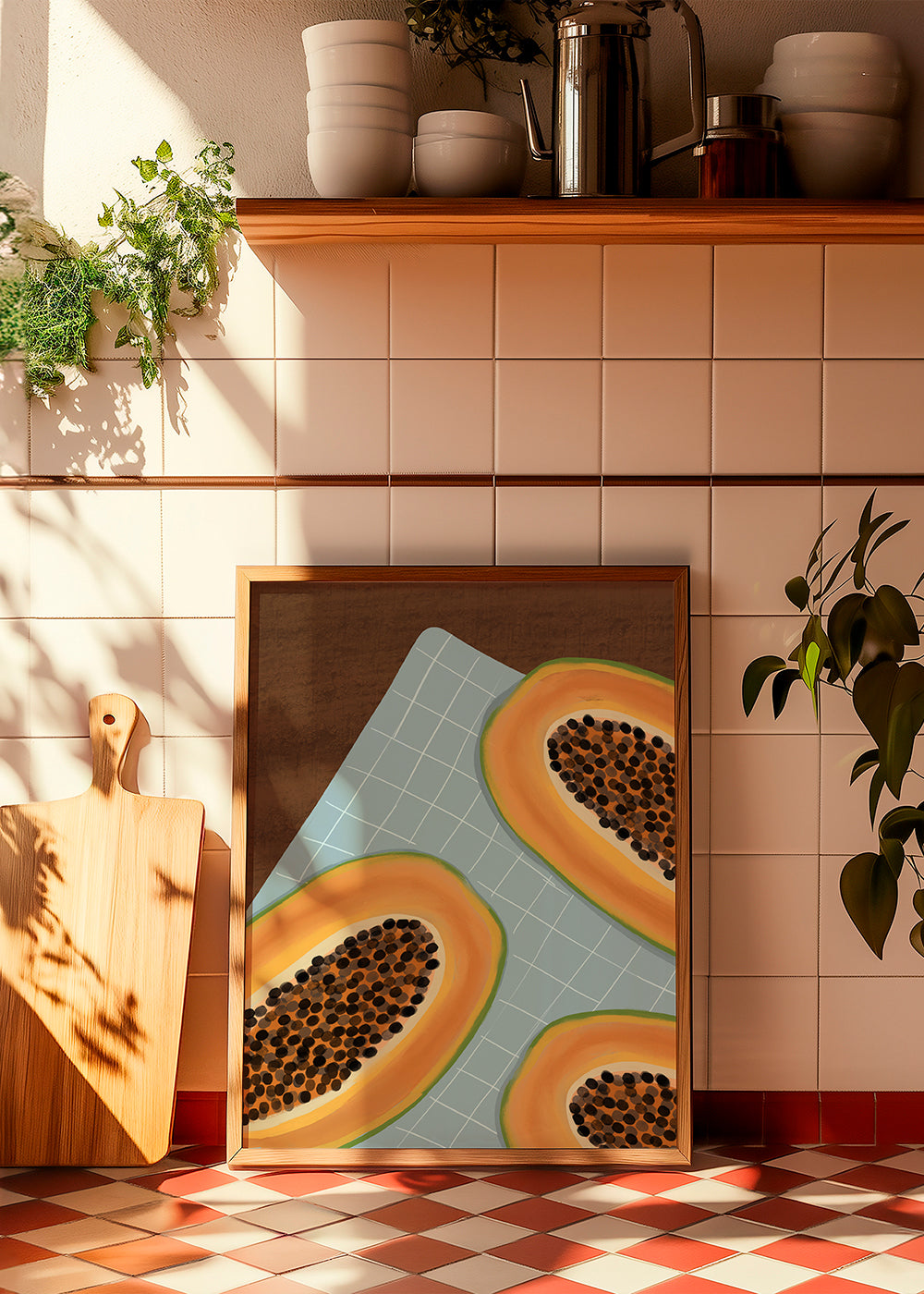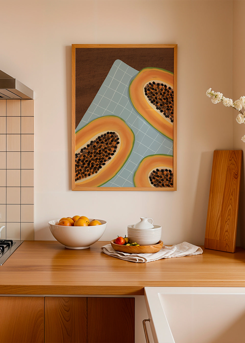 This design in the style of our fruit posters, by the artist Essentially Nomadic, in tones of blue, and vertical layout. Who says decorating the kitchen is hard? Add style to your kitchen walls with this print. Fresh and original.