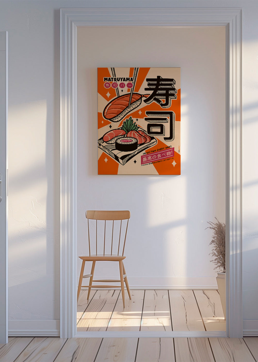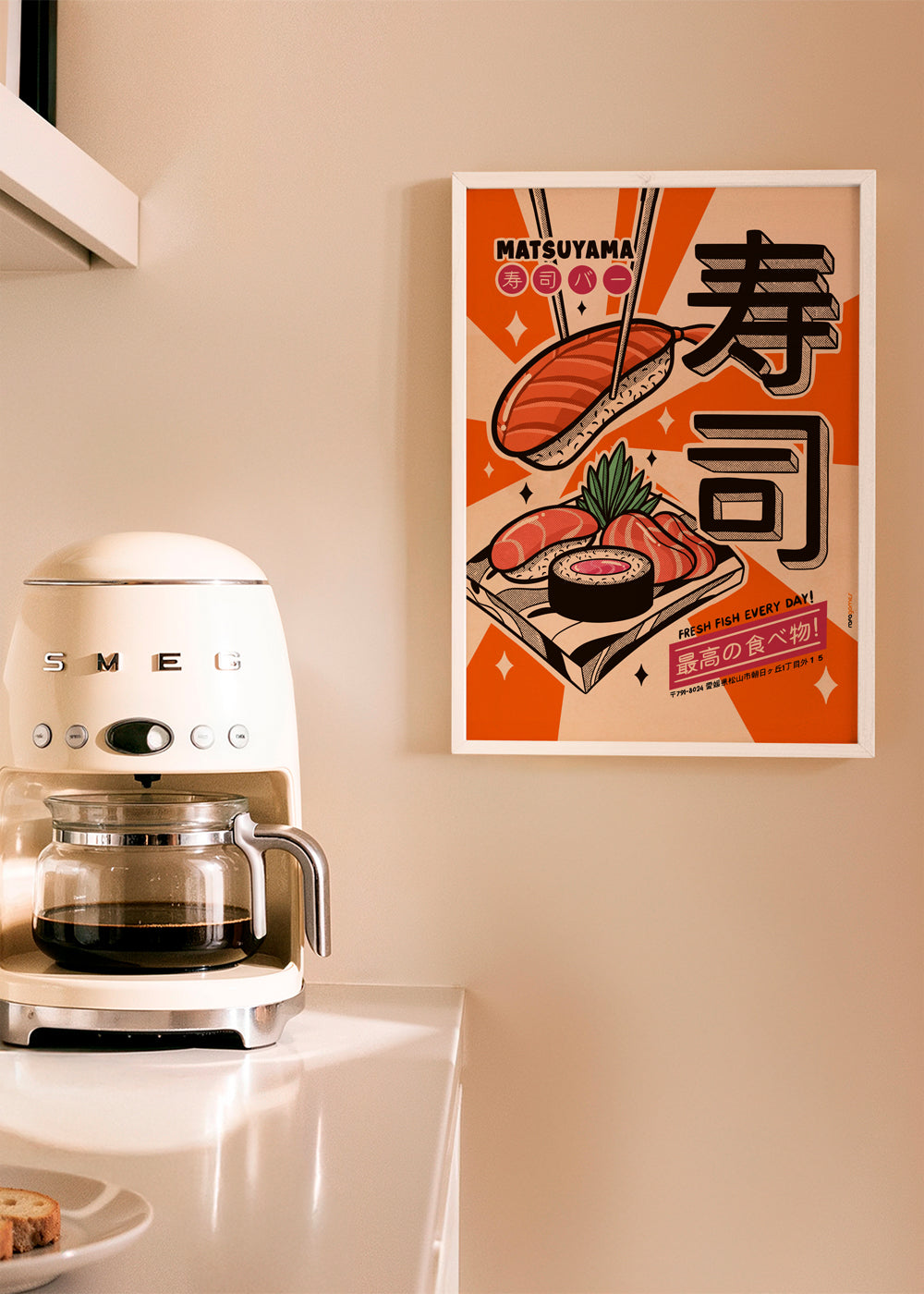 This poster from the japanese wall art collection, from the mind of Rafa Gomes, with pink, and in vertical position. A retro poster you can pair with other vintage-style prints for an original touch in the home. Create a one-of-a-kind spot.