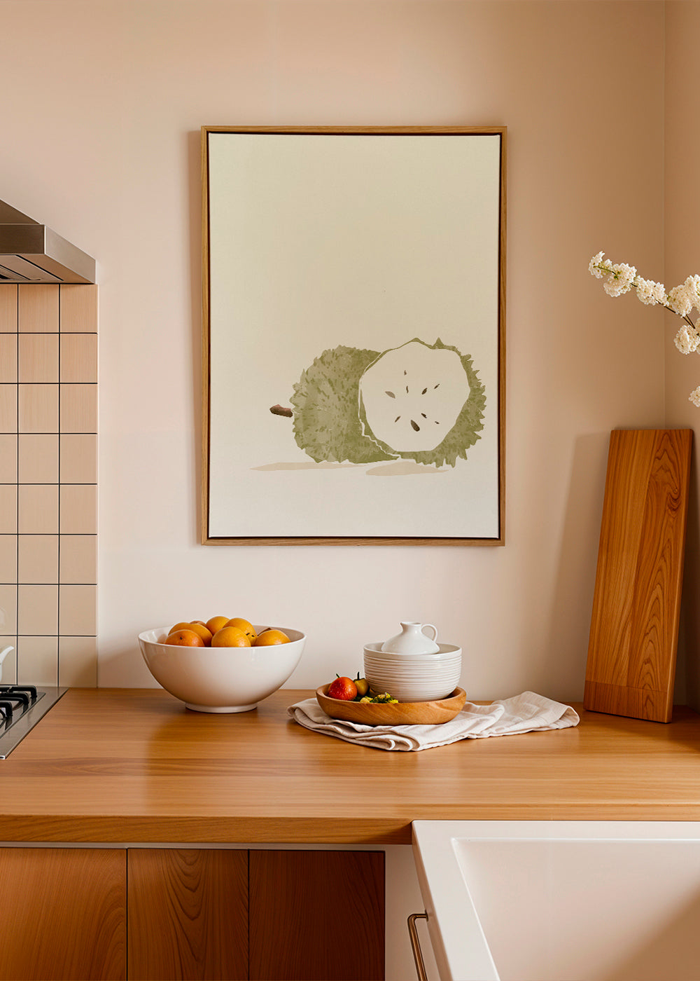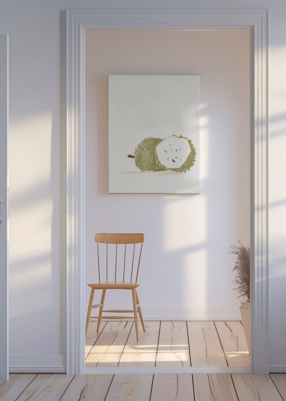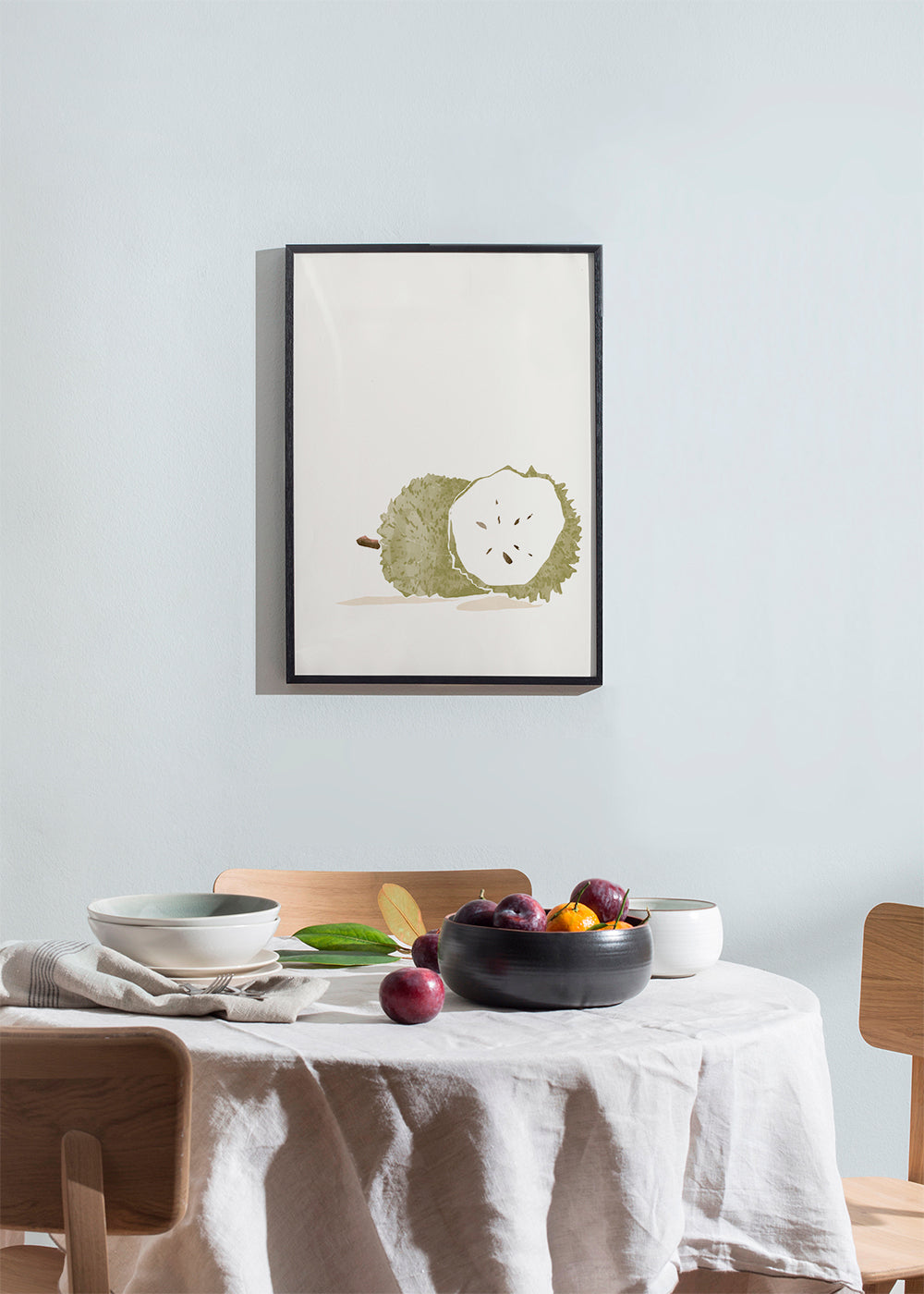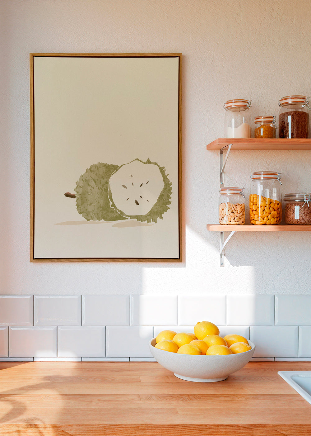 This poster from the fruit posters collection, by Yuyu Pont, in tones of green, and with vertical layout. With this print in your kitchen, cooking will no longer be a problem. You won't be able to wait to get cooking again, just so you can see it. Pair it with other kitchen prints. Get swept away by art.