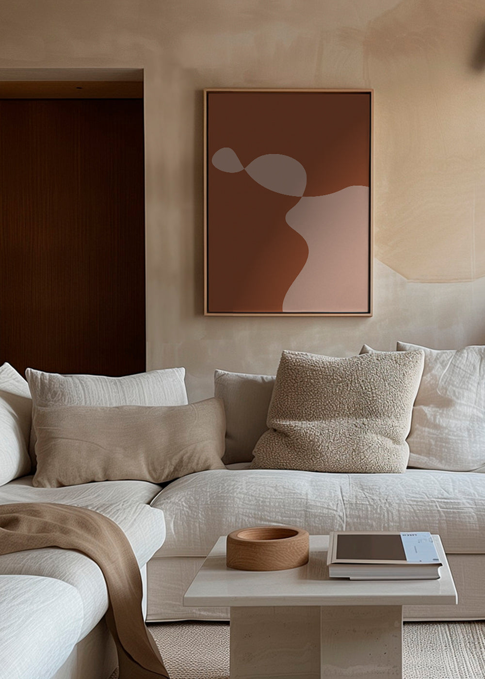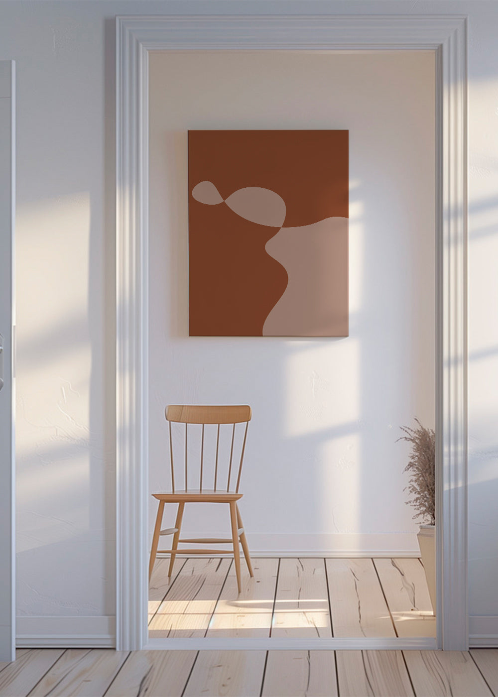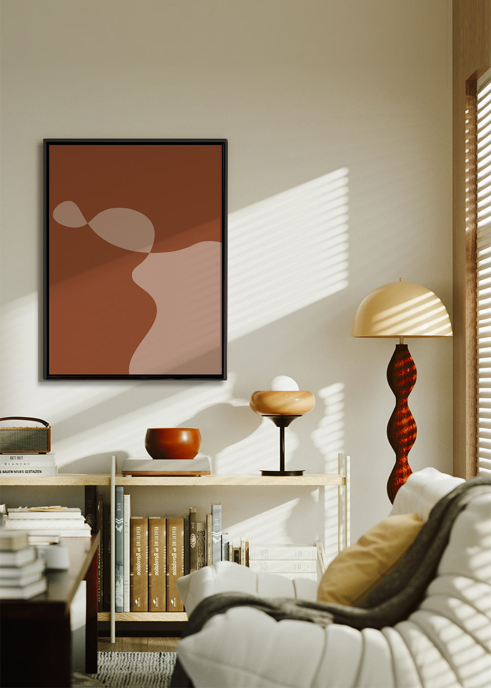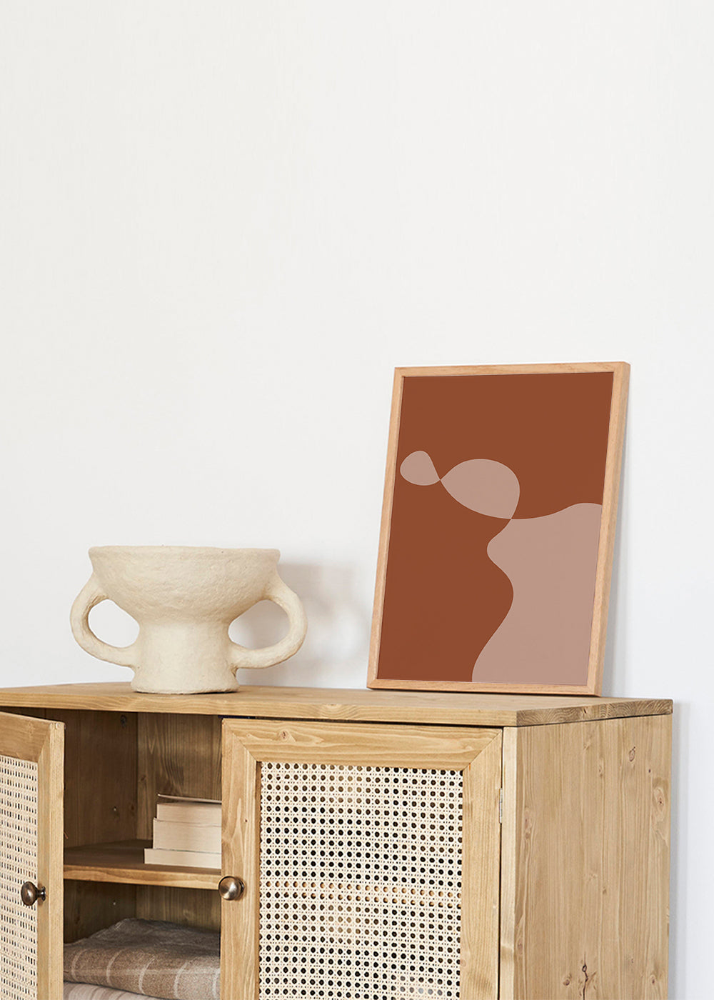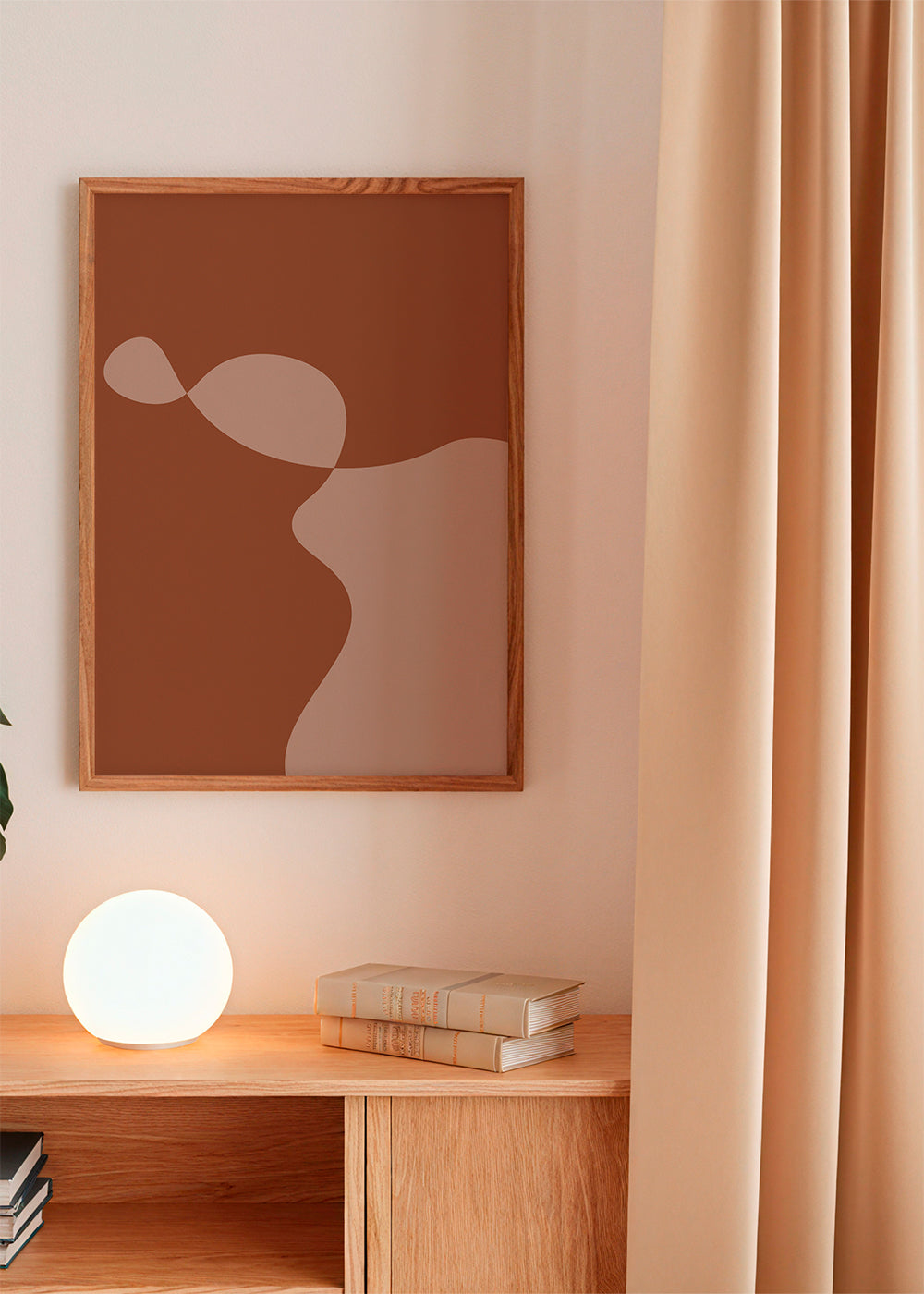 This design inspired by the collection of geometric wall art and prints, created by Studio Krone Kern, with touches of brown, and facing vertically. This piece with abstract shapes is perfect for pairing with other abstract art and geometric prints. A piece that will be a plus for any room.