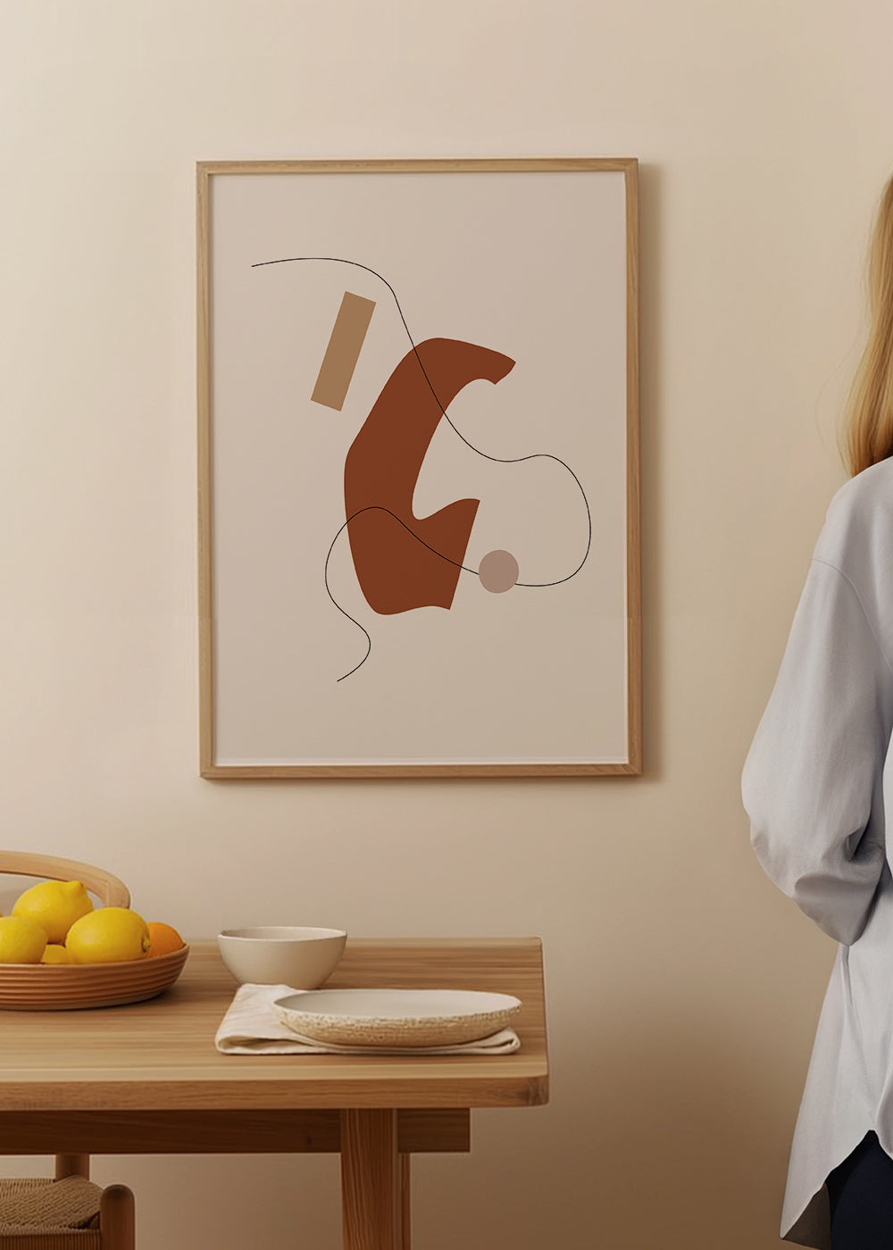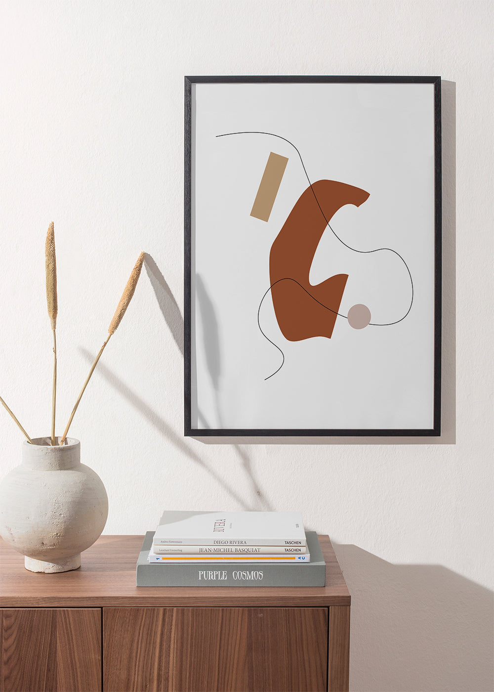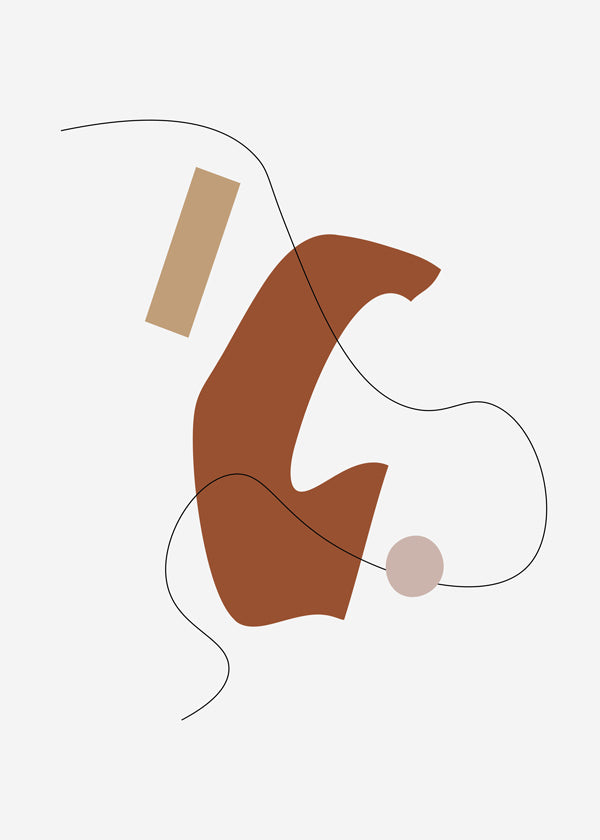 This print from the geometric wall art and prints category, by Studio Krone Kern, in tones of brown, and facing vertically. The abstract, geometric shapes help create a casual, creative setting. Pure art and design.