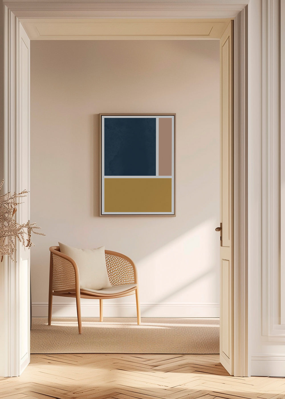 A print from our selection of geometric wall art and prints, by the artist Muthyger, with tones of blue, and with vertical layout. Geometric art is an elegant style to decorate the walls of your home with. Create the perfect environment.