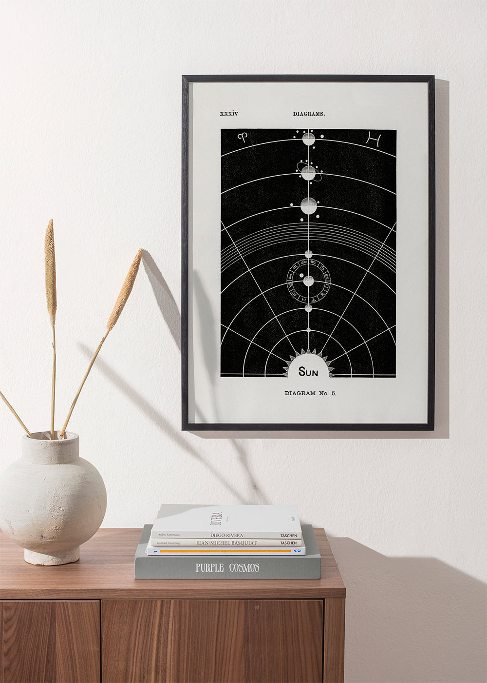 Beautiful print inspired by the collection of space posters, by creative artist 1x, in tones of black, and perfect to hang vertically. A retro poster you can pair with other vintage-style prints for an original touch in the home. Fill your decoration with art.