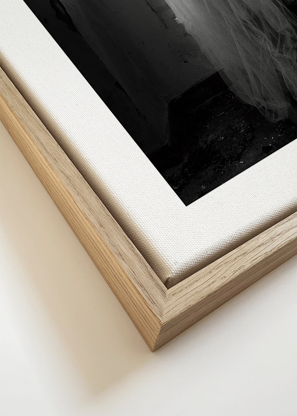 If you select the passepartout option, we will add the white matt board to the frame, and we will reduce the design of the work. For example, if you select a print size 20x28 in, with an oak colored frame and passepartout, we will reduce the design of the print to the previous size (16x20 in). In this way, it will adapt perfectly to the inside window of the passepartout.