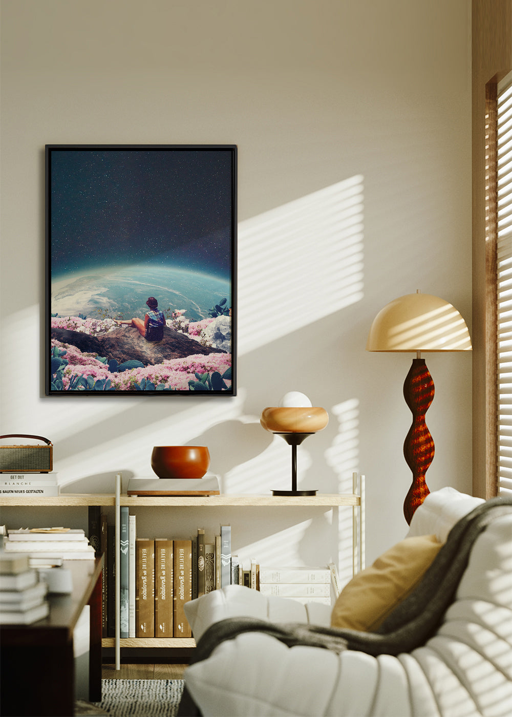 This poster from our repertoire of planet posters, by the artist Frank Moth, with touches of blue, and to hang in vertical position. A retro style that is perfect for a vintage look. An empty wall is a canvas waiting to be painted.