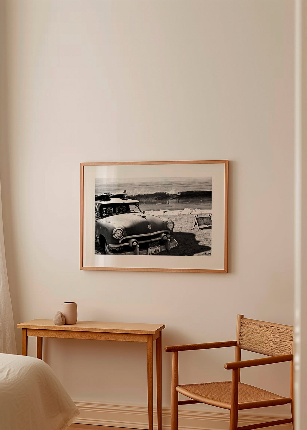 A print from our selection of cars posters and wall art, with black and white tones, and horizontal layout. A retro style that is perfect for a vintage look. Play around with different combinations of our pieces to get the look you want. The white strip around the piece enhances its expressiveness.