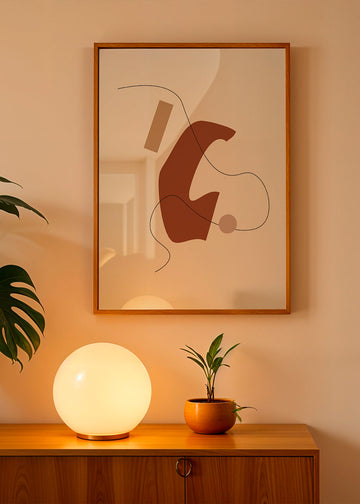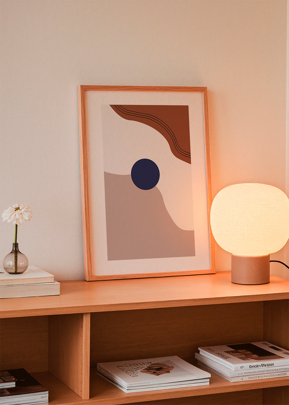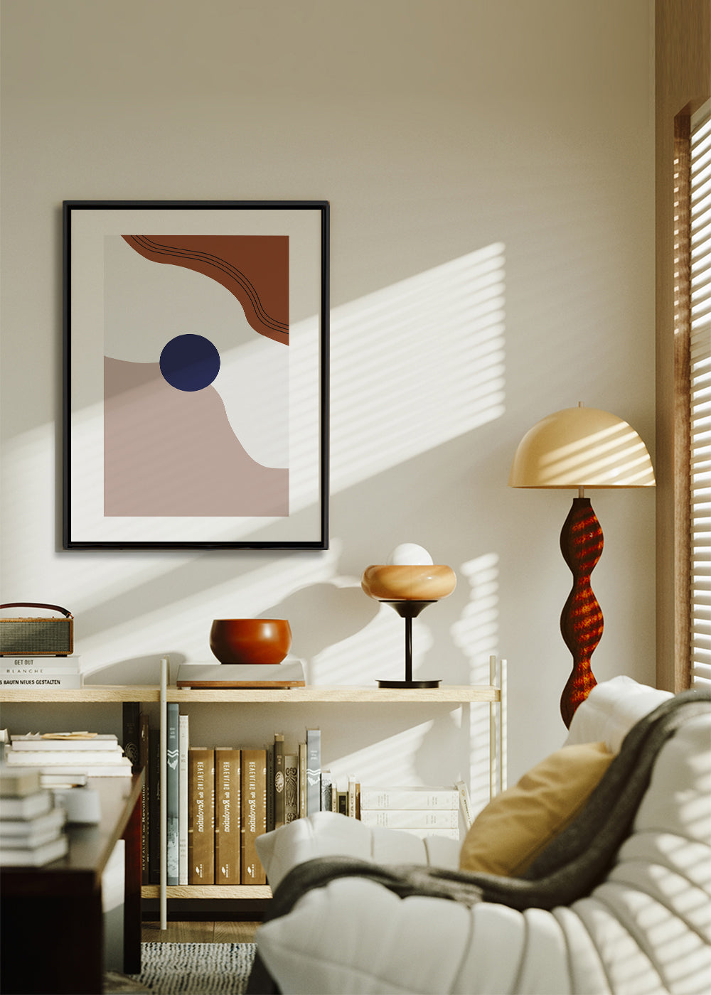 A print from our geometric wall art and prints category, created by Studio Krone Kern, with brown pigments, and to hang in vertical position. The abstract, geometric shapes help create a casual, creative setting. There are no ugly or beautiful walls, just empty or full ones. The white strip around the piece enhances its expressiveness.