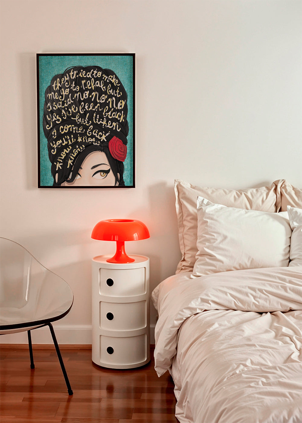 A poster from our posters of famous musicians collection, from the Draw me a song collection, with red tones, and with vertical layout. A piece of art in the minimalist style, simple and easy to pair with other decor. Decorating the walls with minimalist prints is a way to give your decoration style and originality. Create a one-of-a-kind spot.