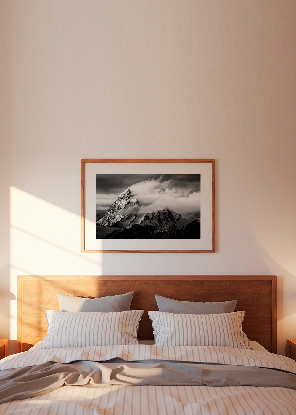 Beautiful design from our mountains wall art category, with black tones, and in horizontal position. A beautiful landscape perfect for pairing with other nature prints. Walls full of creativity. The white strip around the piece enhances its expressiveness.