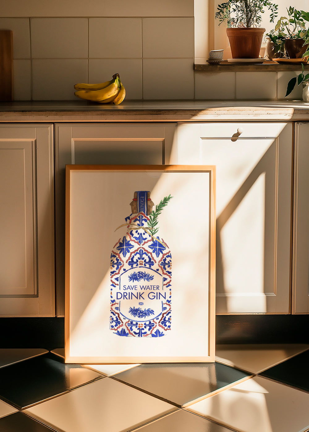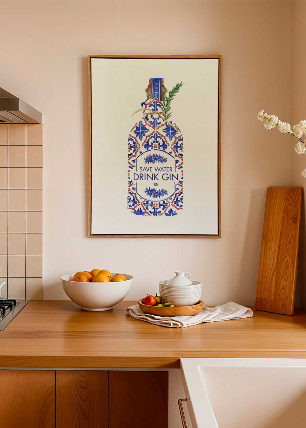 A design from our gin wall art collection, from the collection of the artist Mercedes Lopez Charro, with blue, and with vertical layout. A design for the foodies in the house. Decorate your kitchen with prints; Free your creative spirit, decorate your walls with art.