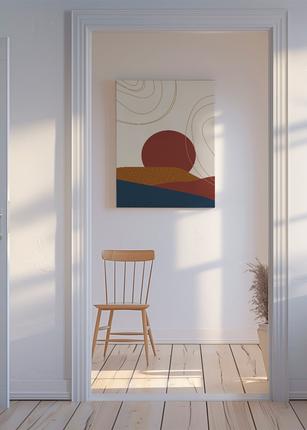 A print from our sunrise and sunset wall art collection, by creative artist Essentially Nomadic, with touches of red, and facing vertically. The tranquillity and freedom of landscape prints is one of a kind. A modern touch for your home.