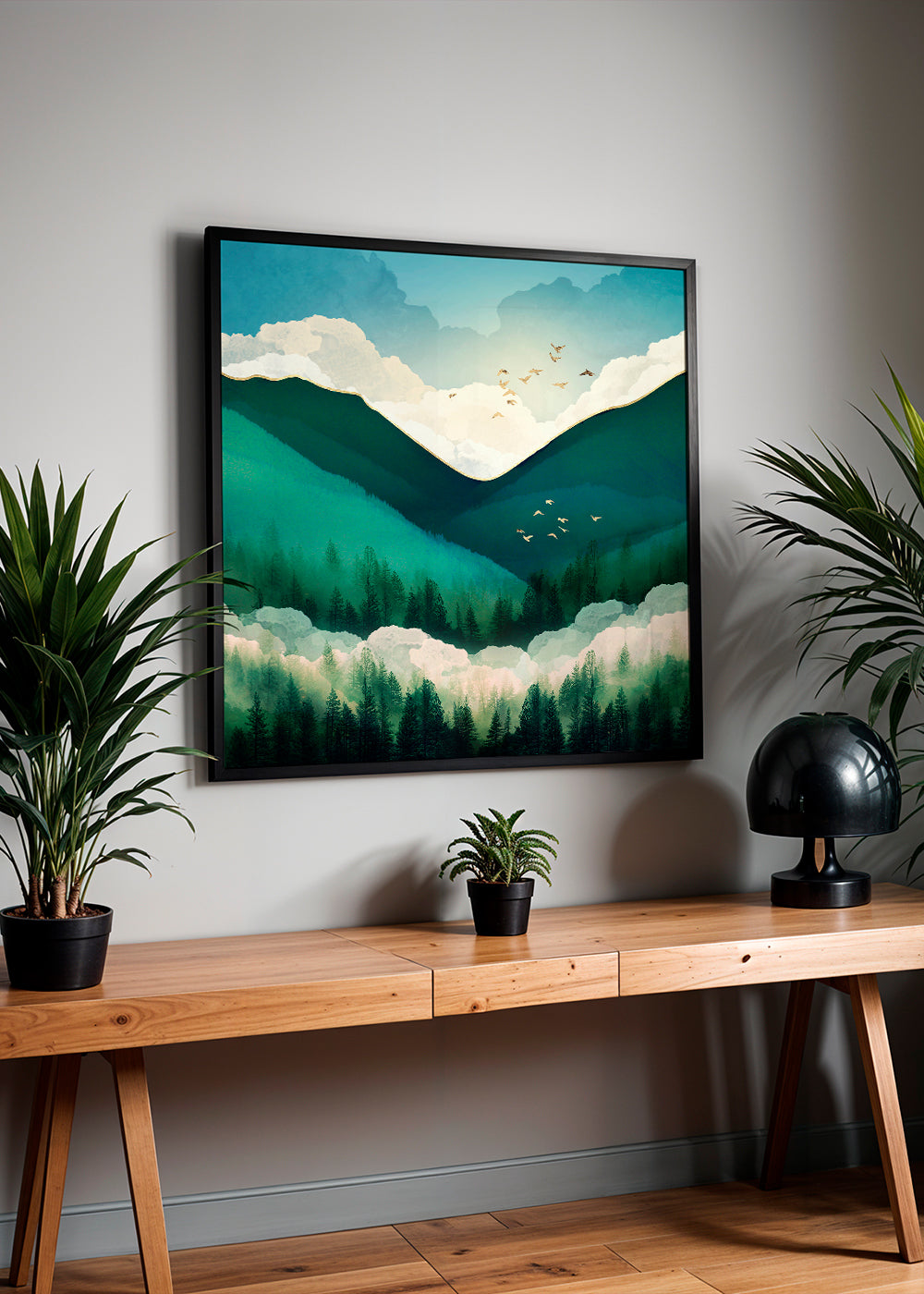 This poster from our repertoire of mountains wall art, made by SpaceFrog Designs, in tones of green. Nature in all its splendour, landscape prints convey a sense of calm. Walls full of creativity.
