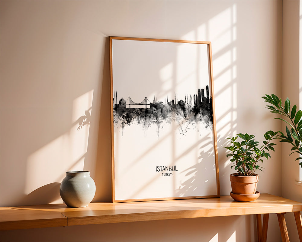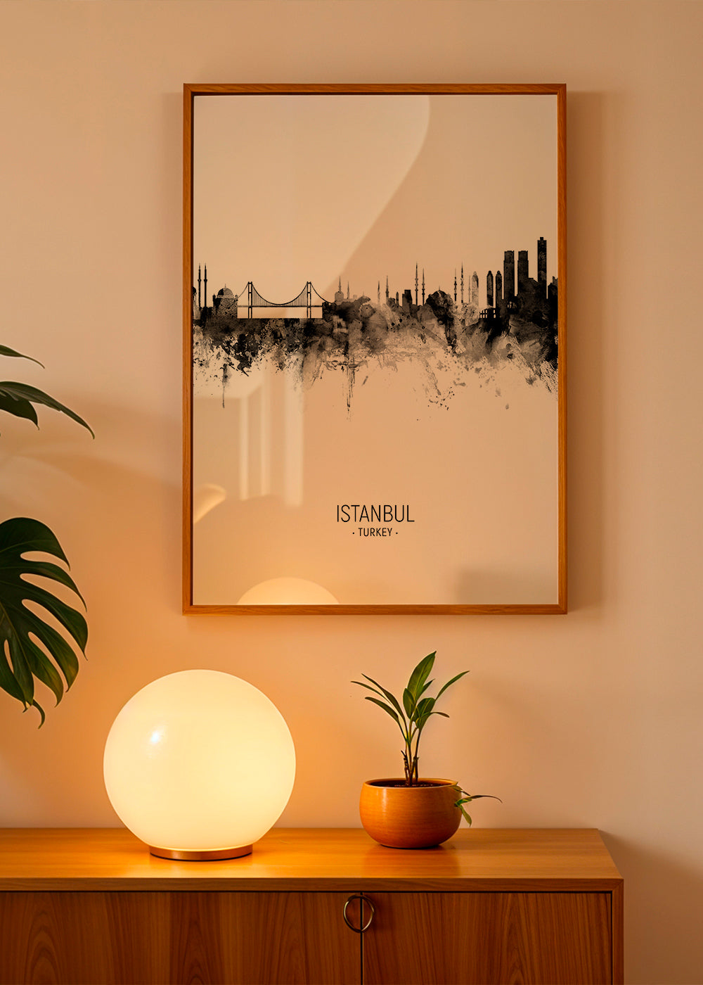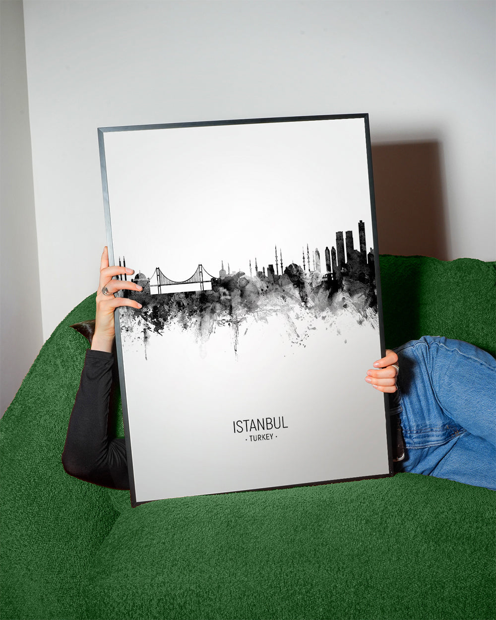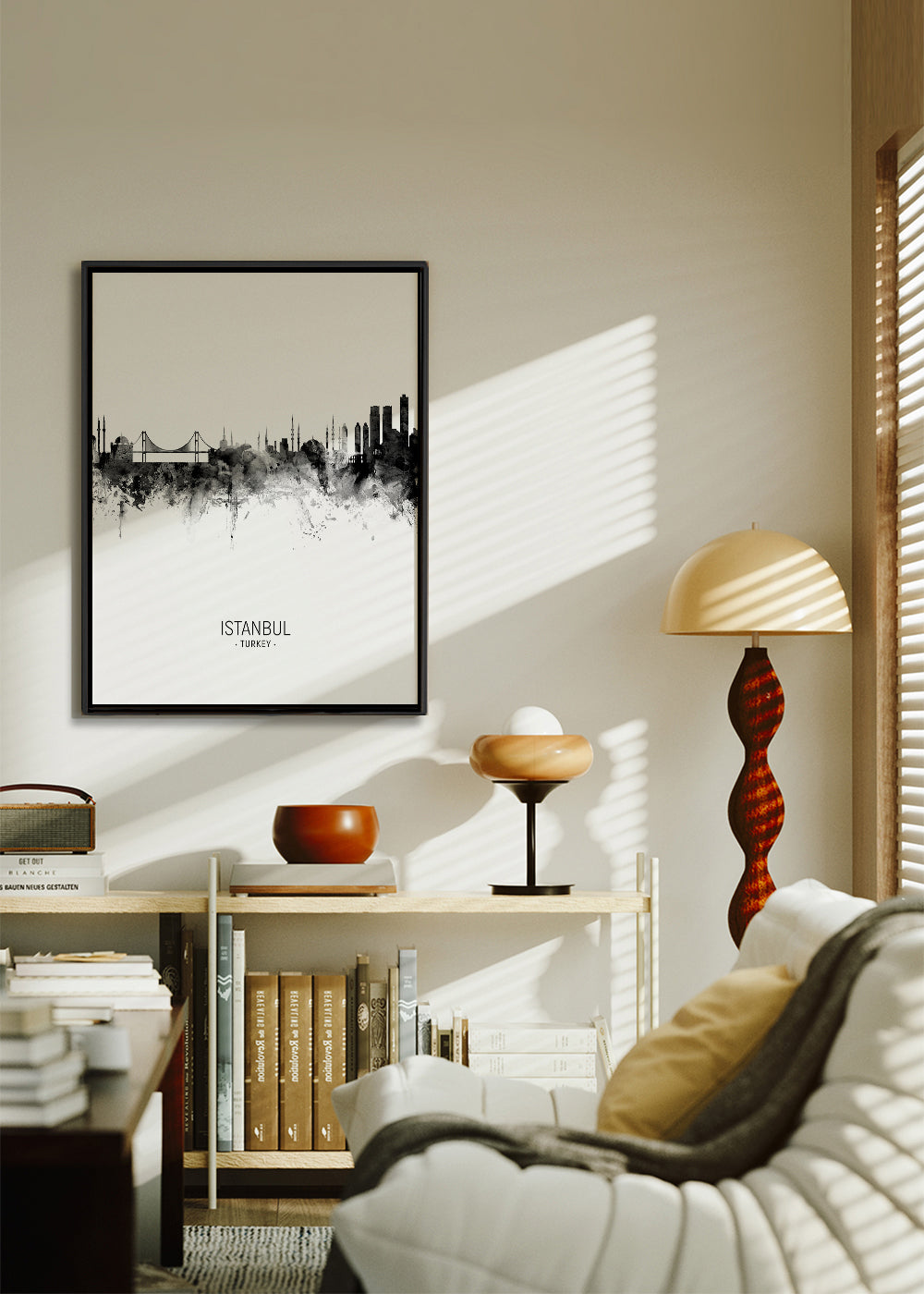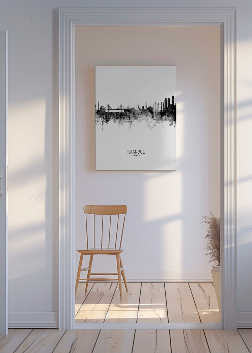 A poster from our skylines canvas collection, from the Michael Tompsett collection, in tones of black, and with vertical layout. If you love wandering around discovering new parts of the world, this print is for you. A wall of posters can change the look of a room.