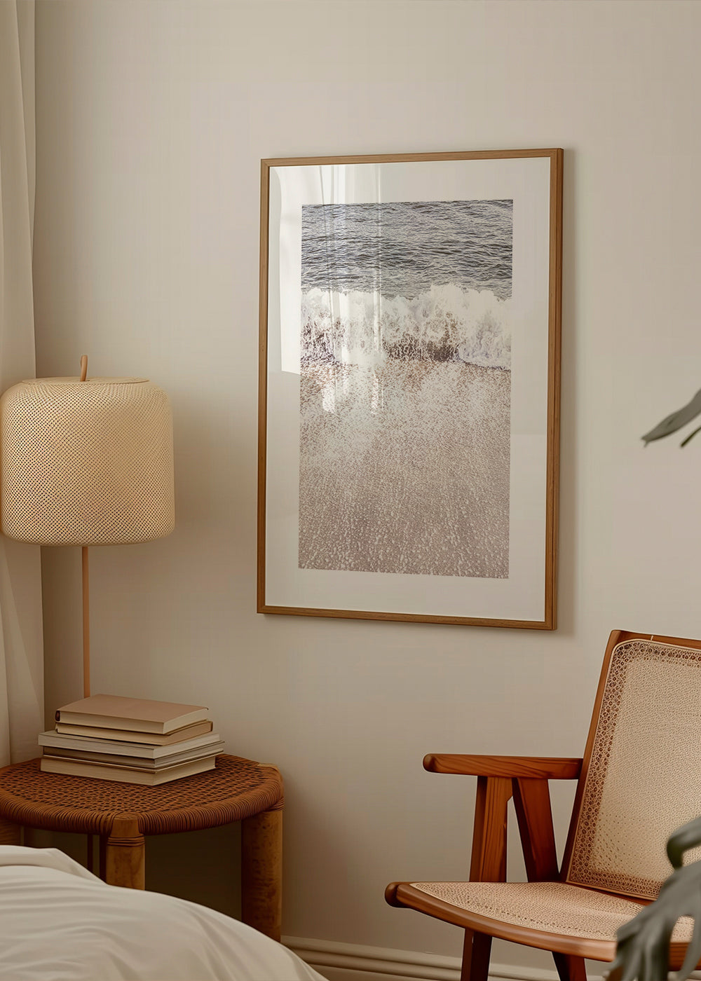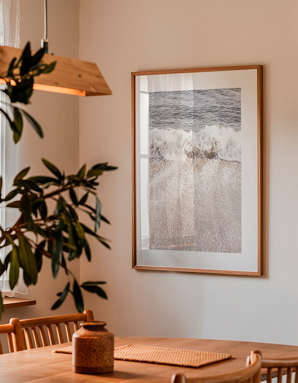 This piece from our beach wall art series, with touches of brown, and with vertical layout. This design is perfect for spaces that convey calmness. Pair it with other relaxing prints for mindful decoration. Refresh a whole room by just adding a few posters on the walls. This piece includes a white strip framing the design to boost its style.