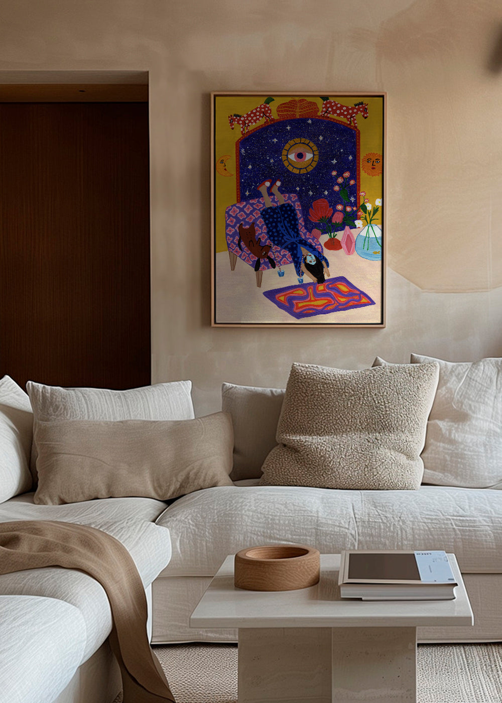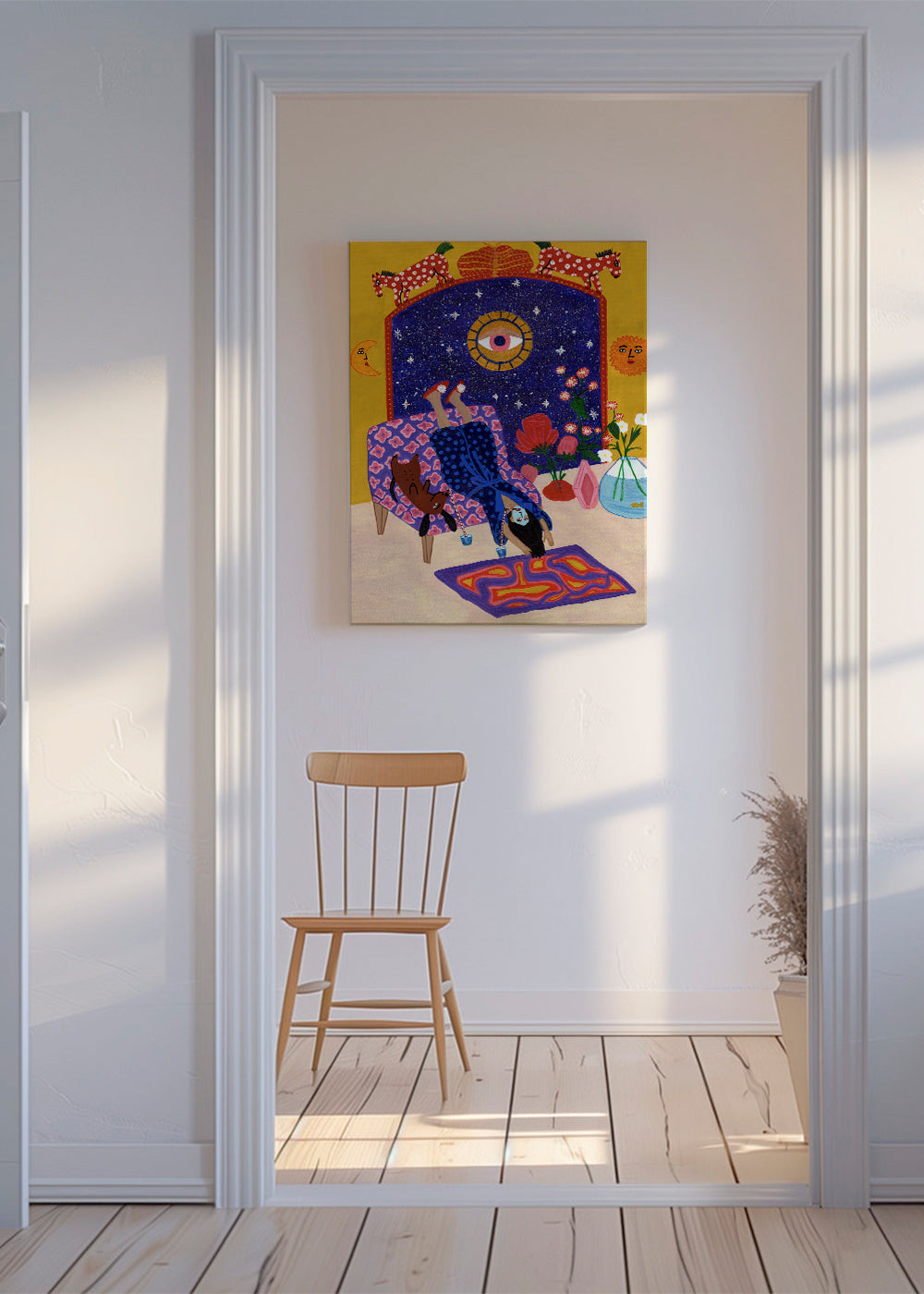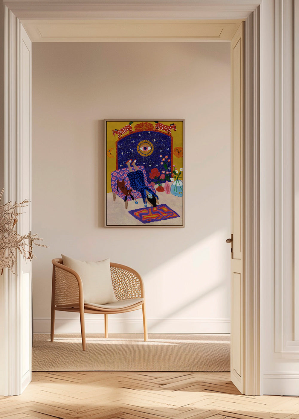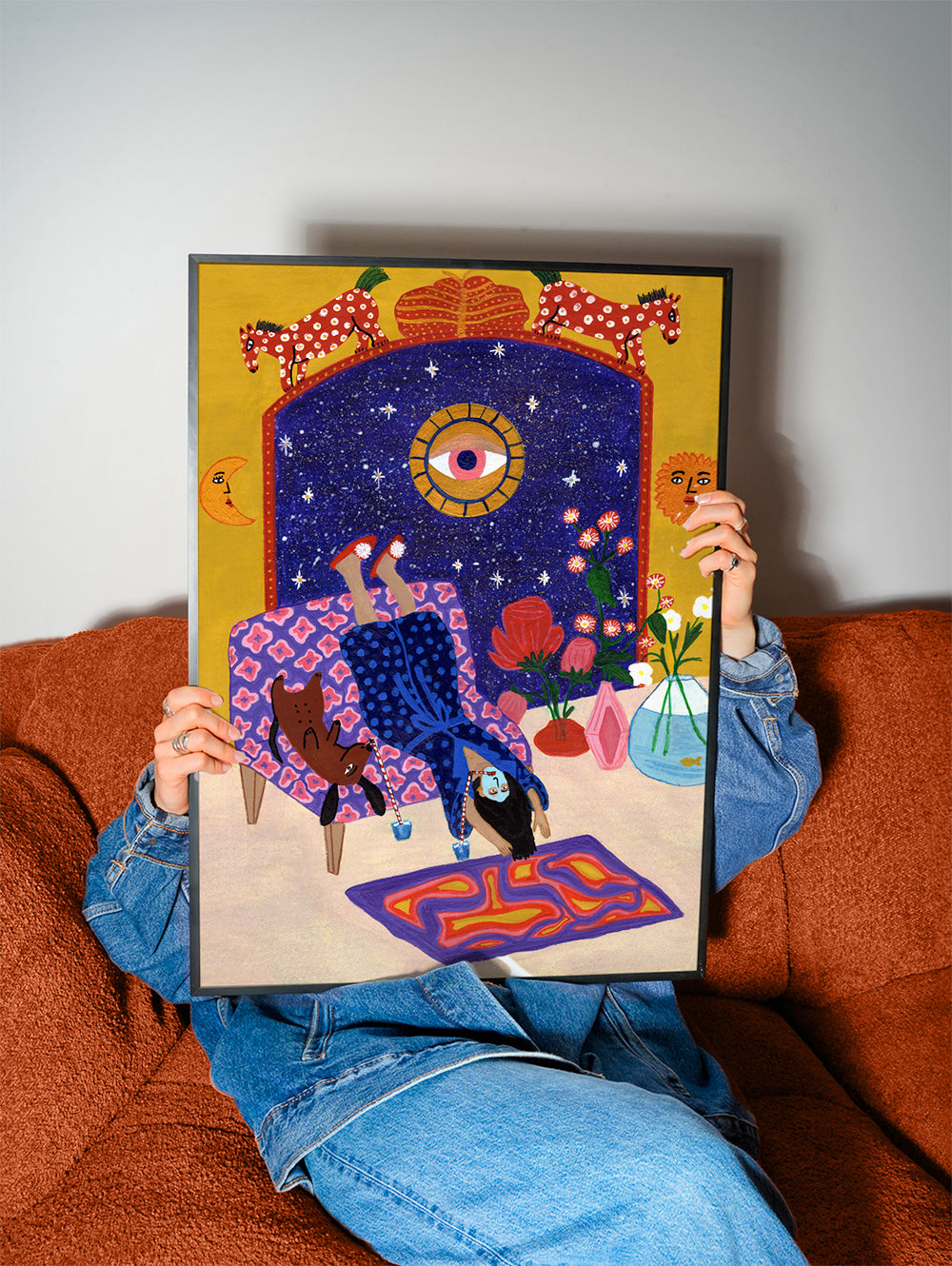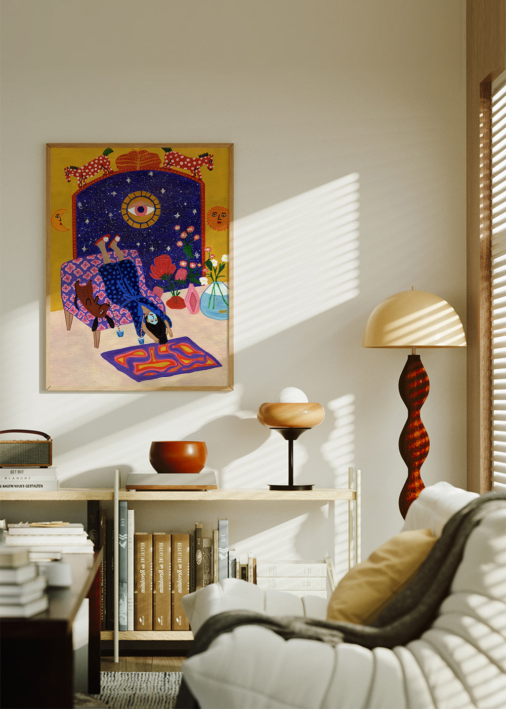A print from our repertoire of illustration wall art, with tones of blue, and to hang in vertical position. The drawing is simple and clean, so you can pair it with other illustrations for an artistic composition. Give your home a new look.