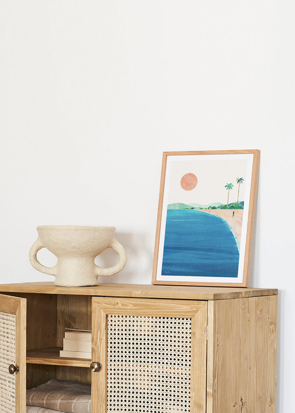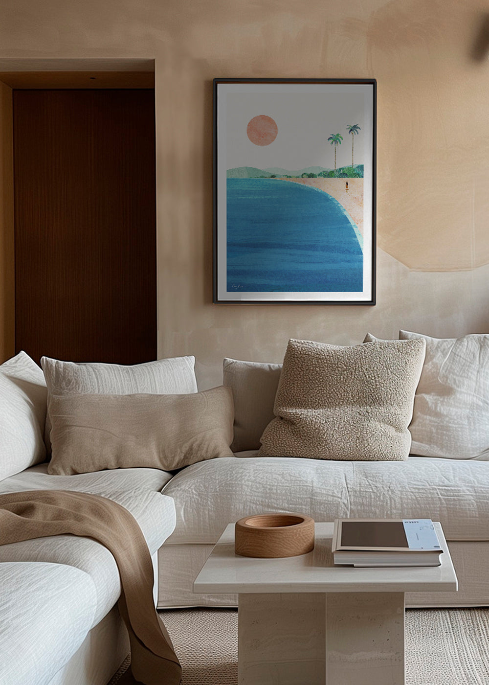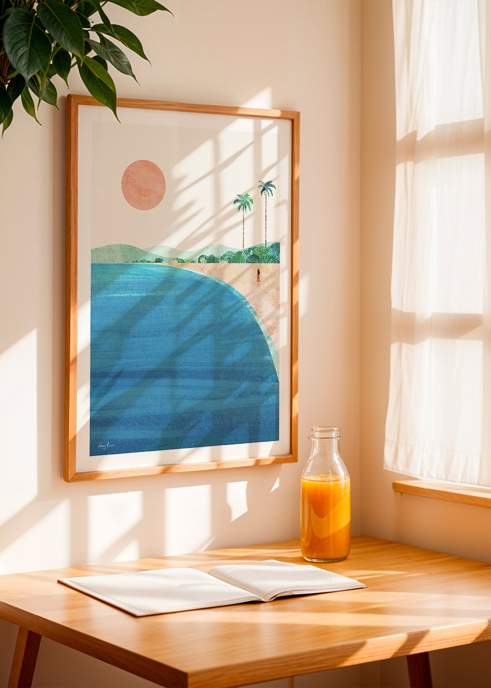 A poster from the ocean wall art and prints series, by Henry Rivers, with blue pigments, and vertical layout. Landscape prints are spectacular; pair them with texts and phrases to create cool wall compositions. Your home decor is in your hands.