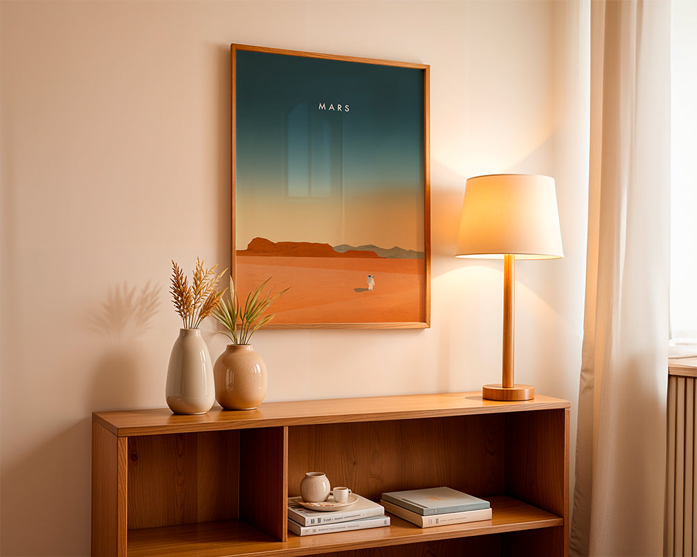 We work with solid wood and aluminum frames. All framed artworks are shipped already assembled and ready to hang. The front protection is high-clarity acrylic glass.