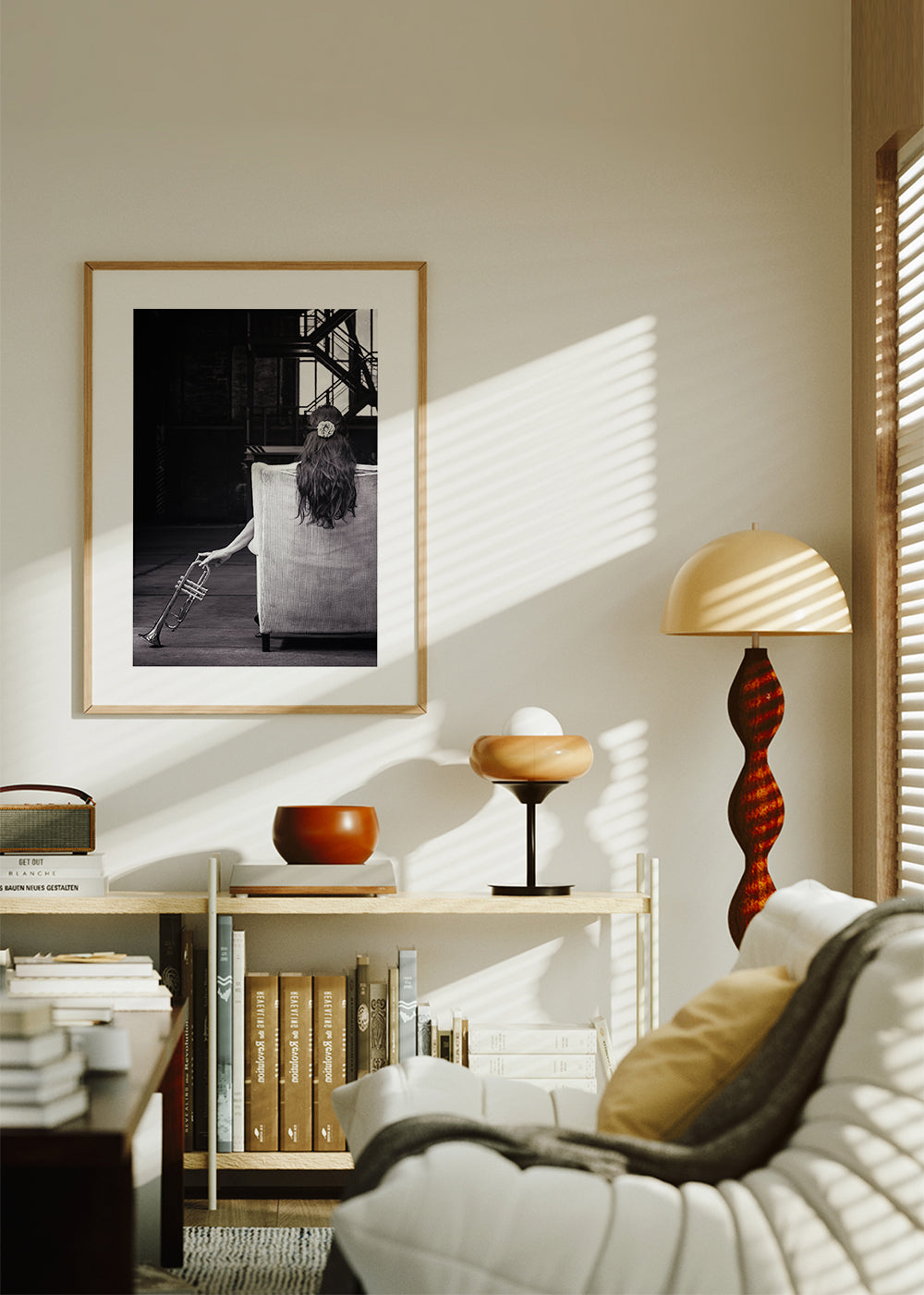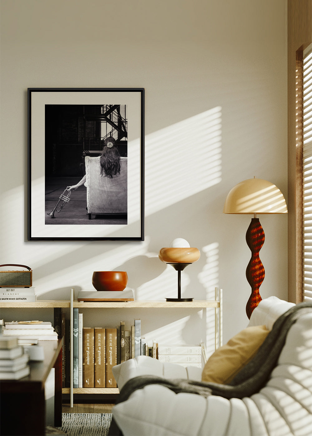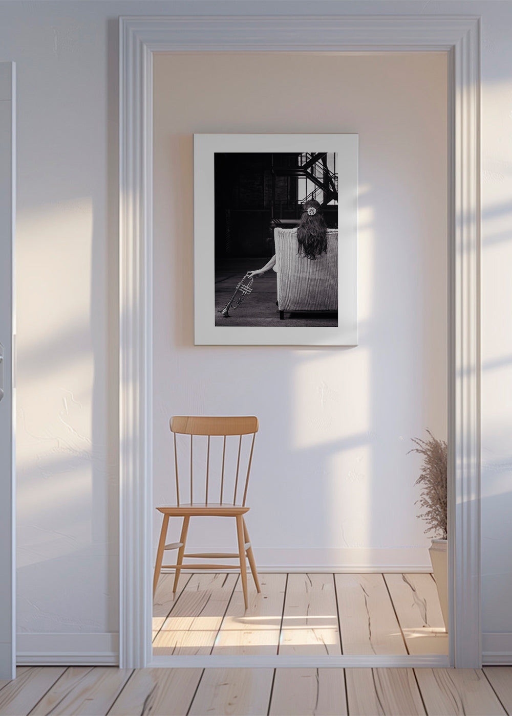 A poster in the style of our jazz music posters, with shades of black and white, and to hang in vertical position. Photos to frame help make any home more modern. A home expresses itself through its walls. This design includes a white strip around it to add contrast to the piece.