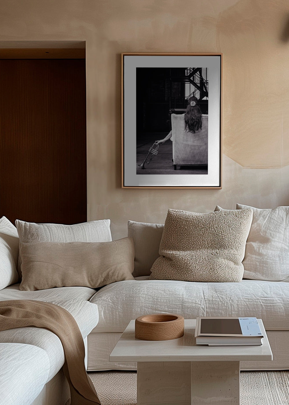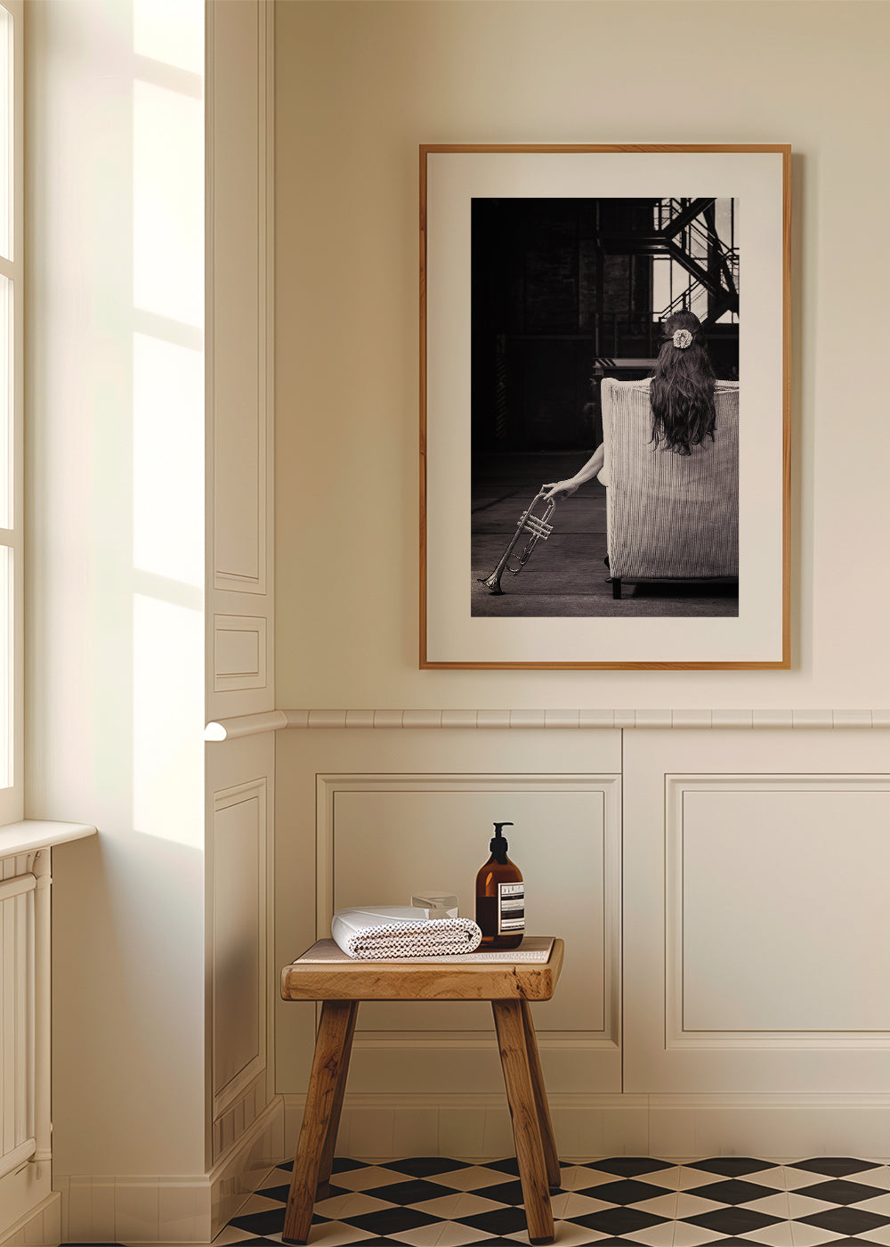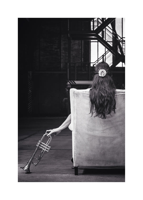 A poster in the style of our jazz music posters, with shades of black and white, and to hang in vertical position. Photos to frame help make any home more modern. A home expresses itself through its walls. This design includes a white strip around it to add contrast to the piece.