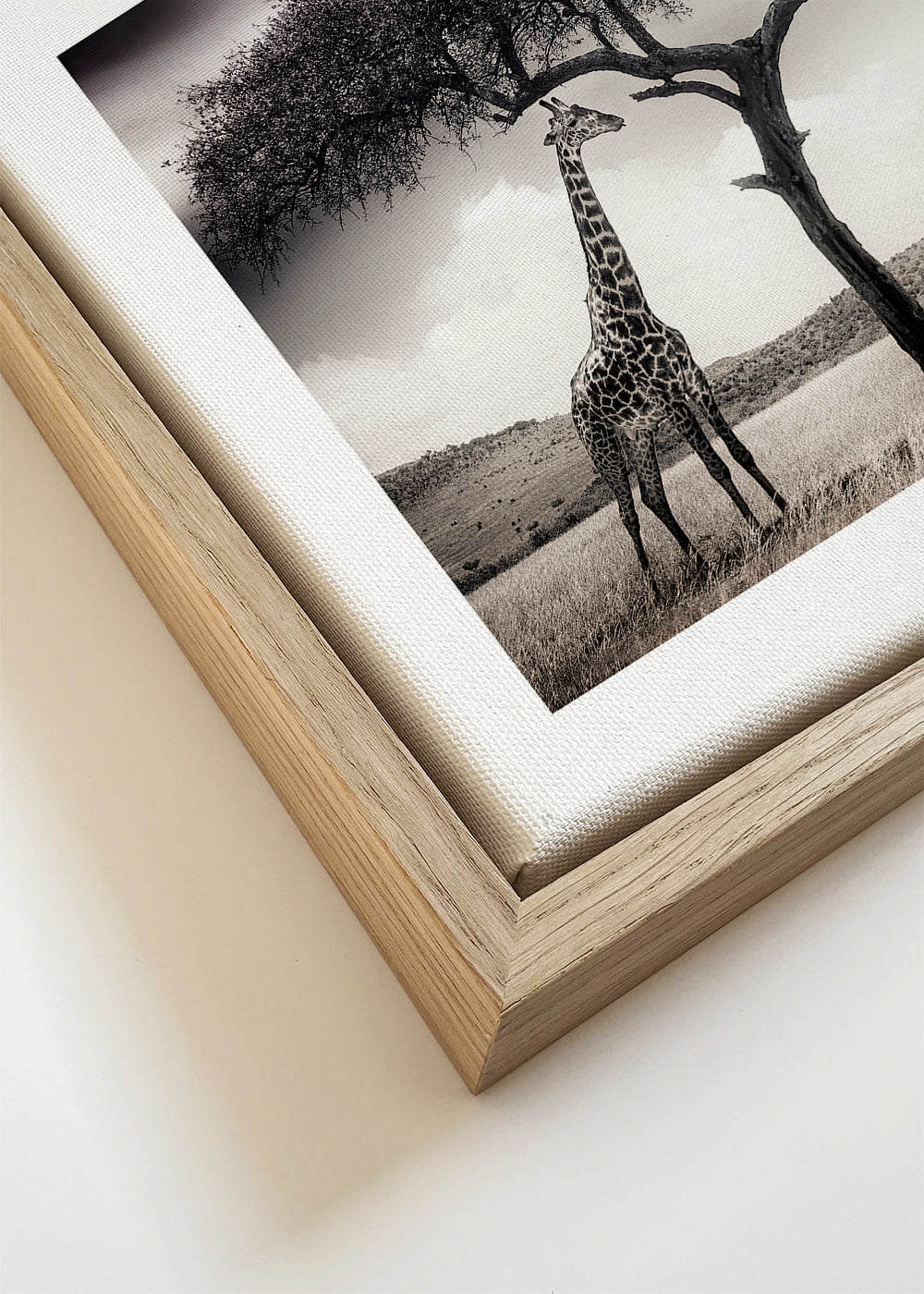 If you select the passepartout option, we will add the white matt board to the frame, and we will reduce the design of the work. For example, if you select a print size 20x28 in, with an oak colored frame and passepartout, we will reduce the design of the print to the previous size (16x20 in). In this way, it will adapt perfectly to the inside window of the passepartout.